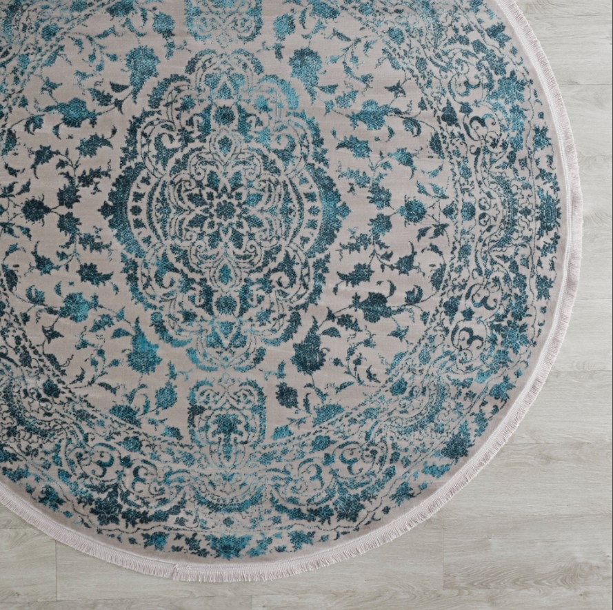 The pattern is symmetrically arranged and delicately woven with threads of a stunning aqua blue, reminiscent of the tranquil hues found in antique Chinese porcelain. This makes the Acanthus Circular Rug not just a floor covering but a statement piece that infuses your space with a sense of history and culture, lending an air of an exotic, bygone era to your contemporary home.