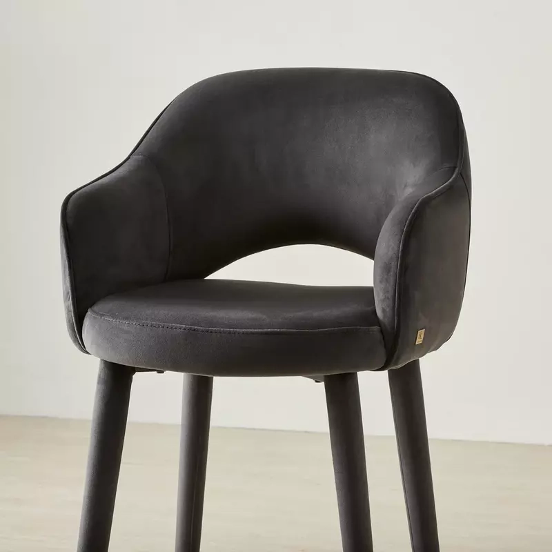 The Adrianna Charcoal Velvet Counter Stool combines modern design with practical comfort. Its curved backrest and armrests provide a supportive seating.