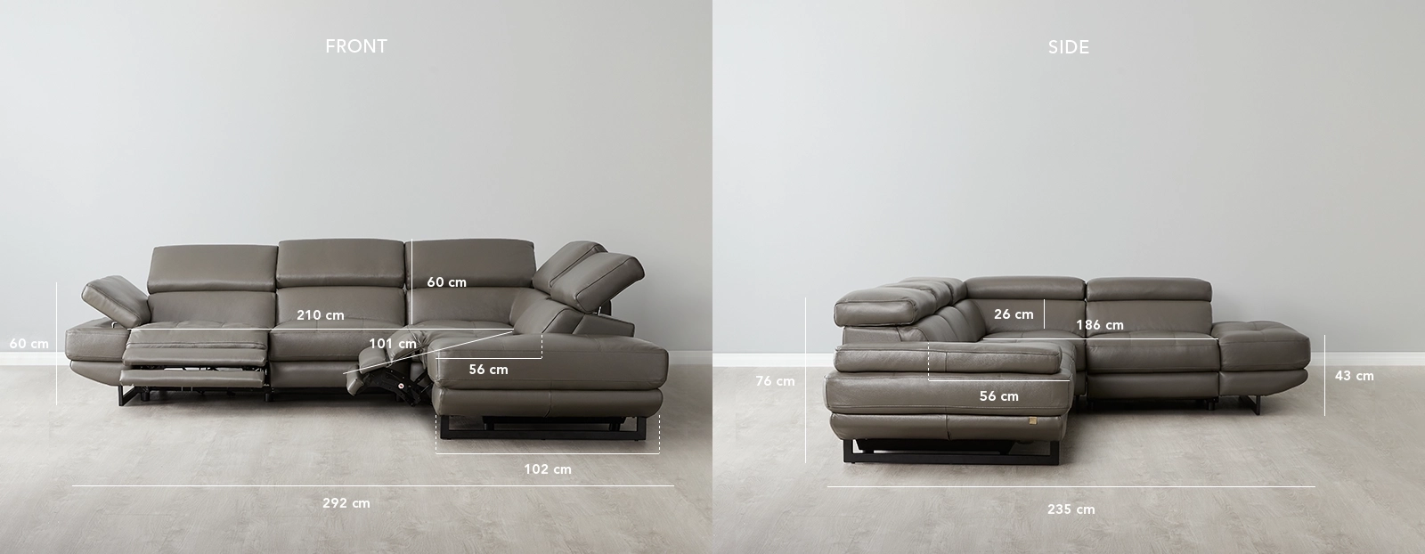 Adorned in genuine Warm Stone coloured leather, the Alessia offers adjustable headrests and reclining footrests for a personalized lounging experience. Immerse yourself in its embrace and let the layers of dense foam envelop you in unparalleled comfort.