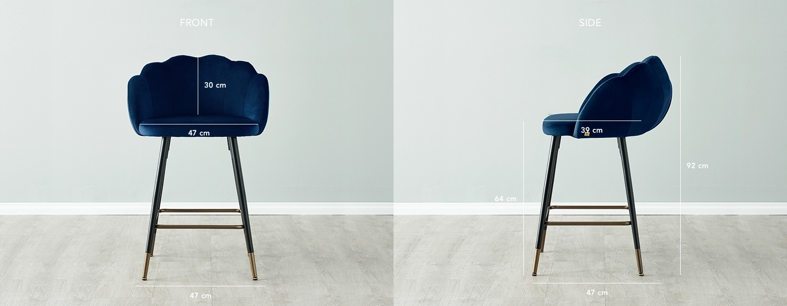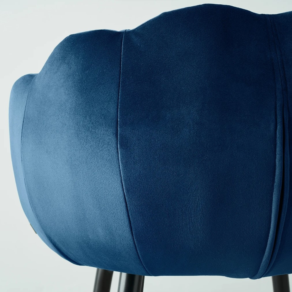 Indulge in the refined elegance of the Amber III Navy Velvet Counter Stool, a true masterpiece that combines artistic design and captivating colours. This stunning piece of furniture captivates with its creatively designed seat and stand-out navy blue hue. The masterfully crafted seat echoes the graceful curves of a beautiful shell from the sea, generously upholstered with rich navy velvet fabric and dense foam, offering a luxurious and comfortable seating experience. The Amber Counter Stool exudes elegance from every angle. Its backrest is adorned with channel tufts, adding a plush and sophisticated look.
