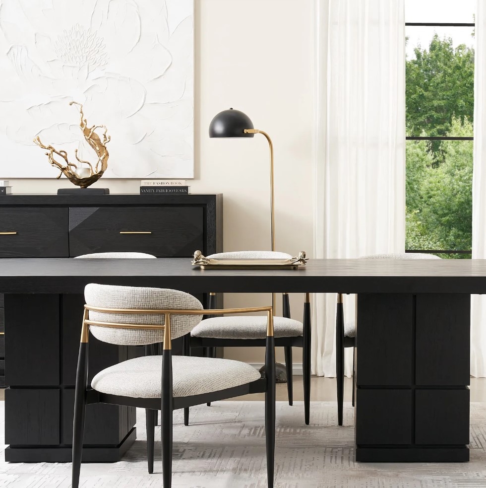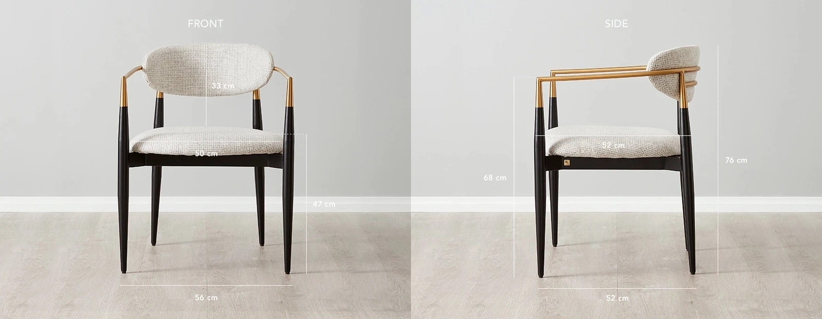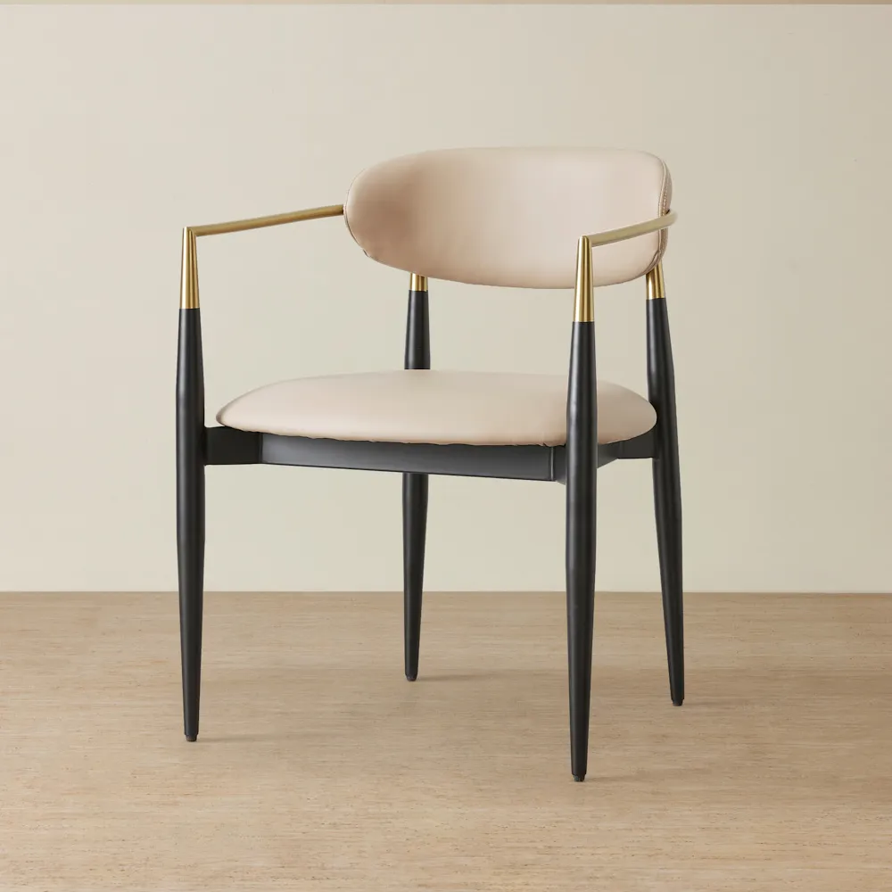 The Amy Dining Chair captures the timeless beauty of the Viscount chair design, celebrated for its elegant simplicity. With golden-coloured embellishments and a striking black metal frame, it effortlessly combines traditional charm with contemporary style.