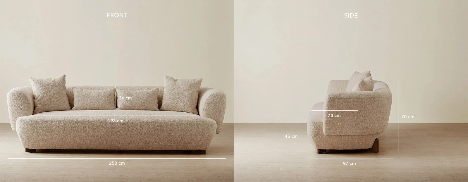 The Antonella Fabric Sofa is upholstered in mid beige woven fabric, offering a soft and textured surface. With its spacious design, it’s a versatile choice for modern living spaces.