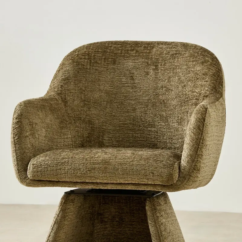 The Antonia Dining Chair in Army Green brings modern comfort and form to the dining space. Its smooth, rounded silhouette flows into gently curved arms.