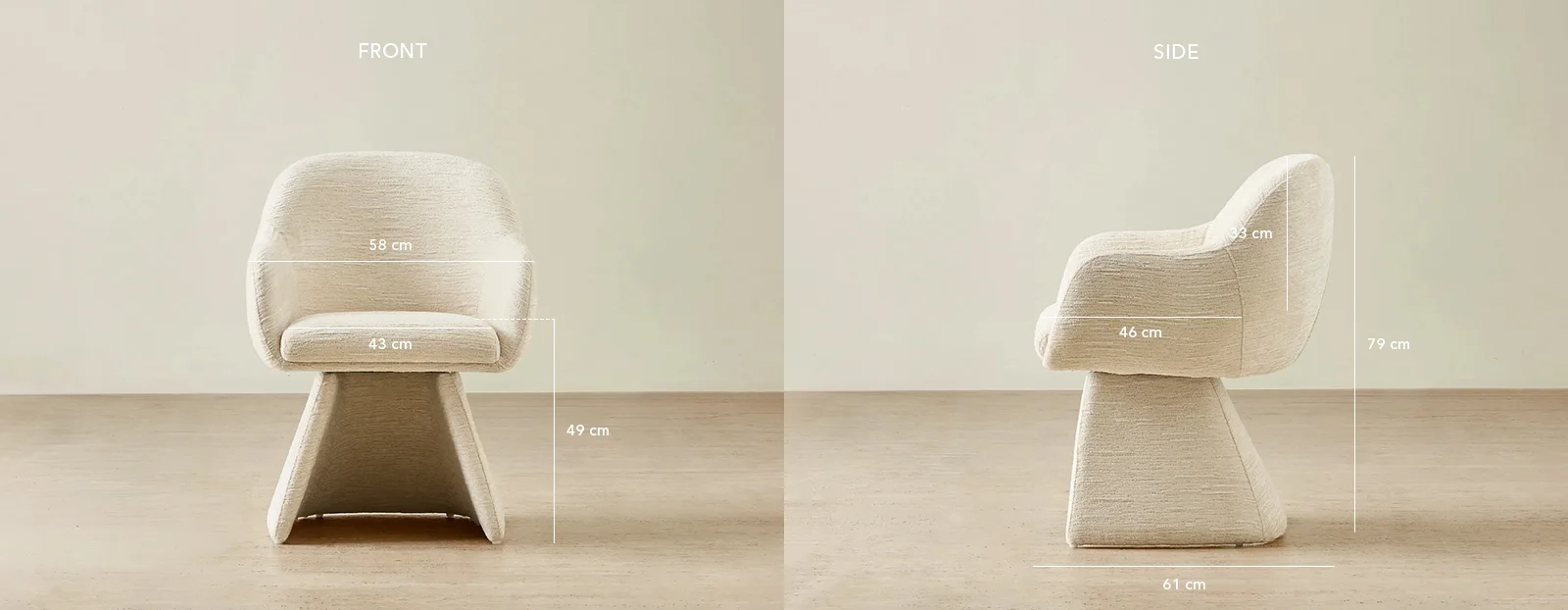 The Antonia Dining Chair in Atlas Cream Chenille Fabric brings modern comfort and form to the dining space. Its smooth, rounded silhouette flows into gently curved arms.