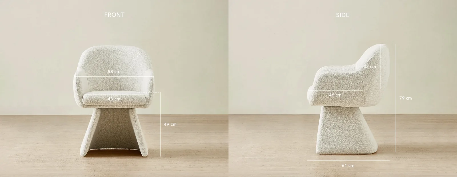 The Antonia Dining Chair in Stone White brings modern comfort and form to the dining space. Its smooth, rounded silhouette flows into gently curved arms.