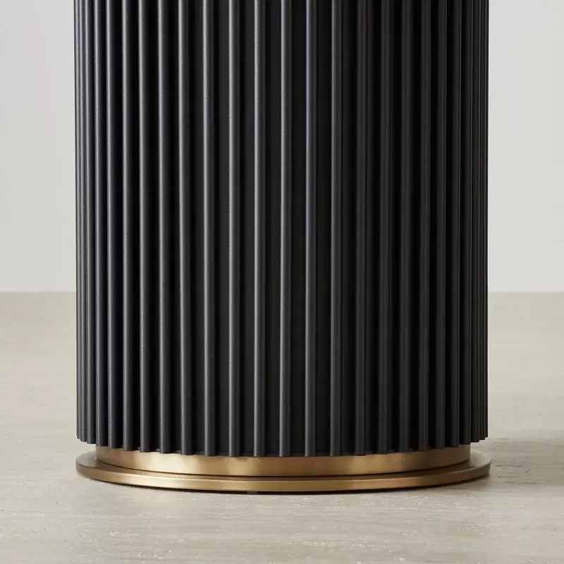 The two column legs, featuring subtle reeding, give the table a balanced, architectural feel that anchors any dining space. This design brings an elegant, structured element that complements the luxurious tabletop beautifully.