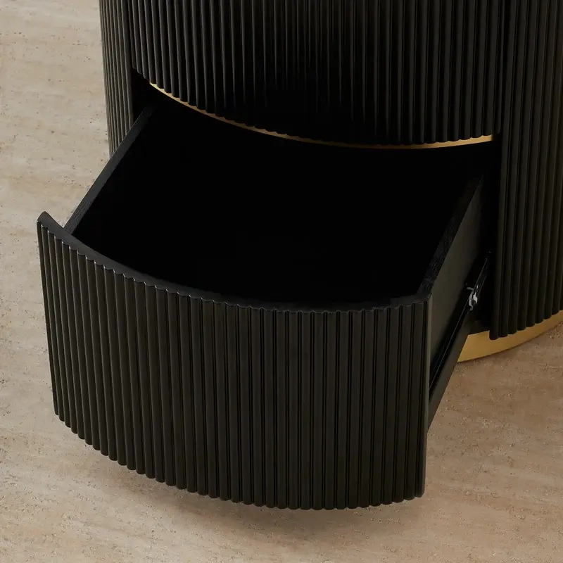 Archie Bedside Table embraces Art Deco with its fluted texture, curved silhouette, and brass-toned base. Its rounded form softens the look, making it both bold and balanced.