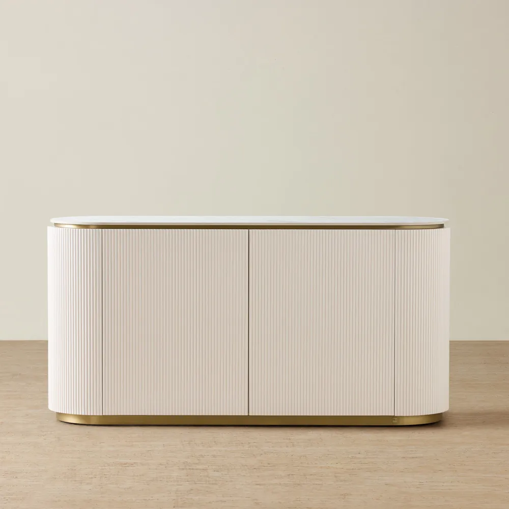 The Archie Sideboard marries durability with high design, featuring a resilient white sintered stone top. This pristine surface is supported by sleek black stainless-steel panels, grounded with a luxe golden base.