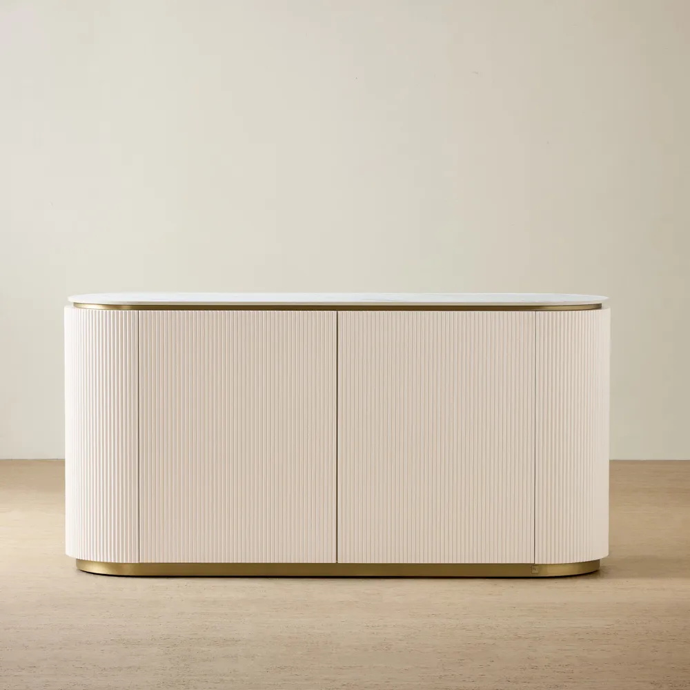 The Archie Sideboard marries durability with high design, featuring a resilient white sintered stone top. This pristine surface is supported by sleek black stainless-steel panels, grounded with a luxe golden base.
