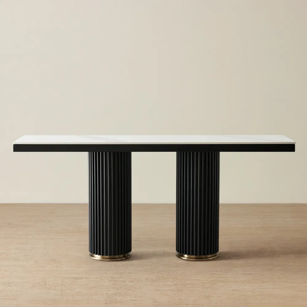 The Archie Study Desk combines luxurious sintered stone with refined design for an upscale workspace. Its polished white tabletop is complemented by intricate fluted detailing and brass-finished accents.