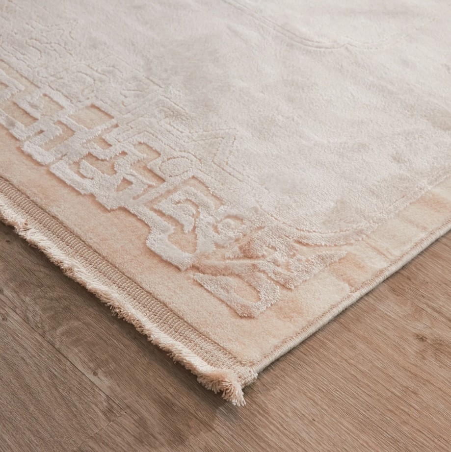 Prepare to step onto the Ariana Floor Rug, a masterpiece underfoot that marries neutral tones with a captivating design. This rug is a testament to artisanal skill, each thread meticulously woven to depict the ethereal beauty of sand swept across ancient glyphs. The design is subtle yet intricate, with faint lines and carefully crafted borders that suggest a storied past carved by time.