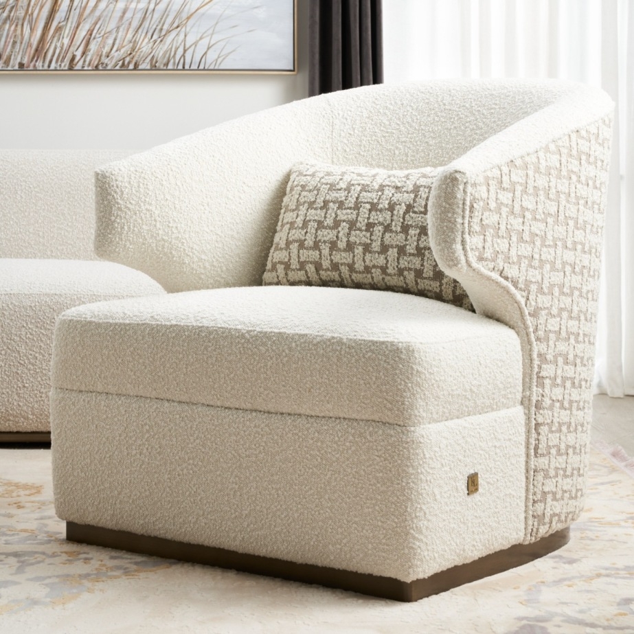 The Arlo's curvilinear frame is lined with fabric and foam for extra comfort. A chain-like motif in Light Grey and Vanilla adds an edge to its elegance. The brass steel base enhances its look while providing stability.