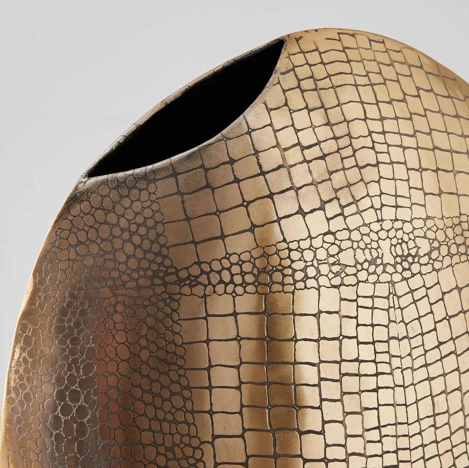 Practicality is woven into its design with an opening at the top, which serves as an invitation for creative decorating. Whether filled with a bouquet of fresh flowers, ornamental branches, or left empty to appreciate its own beauty, the vase is versatile enough to cater to a wide array of styling needs. The body of the vase is adorned with a crocodile scale-like motif, a textural feast for the eyes and fingers alike.