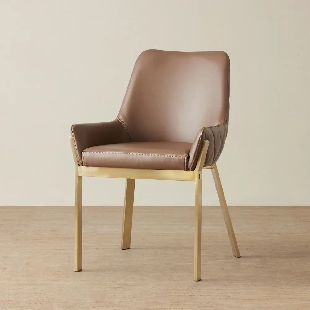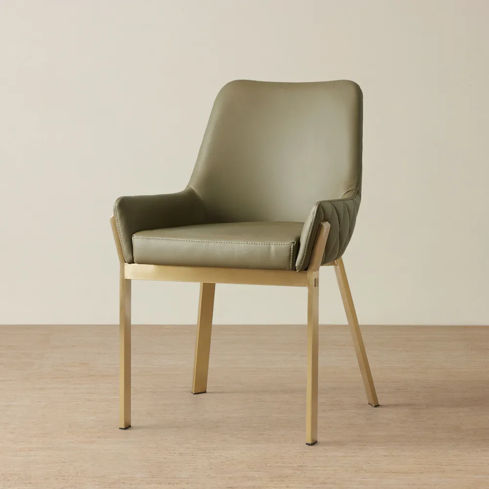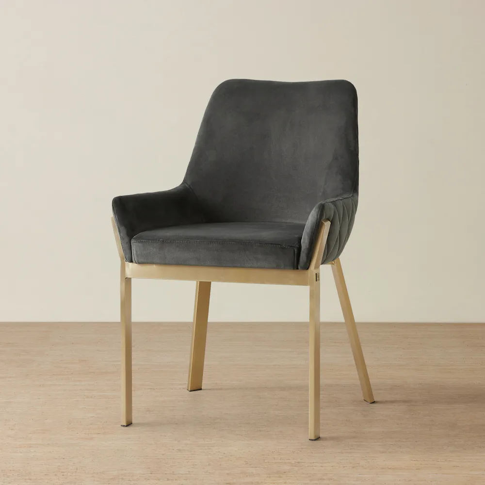This chair is framed in a chic brushed golden hue, adding a dash of sophistication and warmth to its aesthetic. The combination of beige velvet and the golden frame infuses your dining space with a cozy yet elegant vibe. For a dining ensemble that exudes majesty and comfort, pair the Arya II with one of our grand dining tables, and create a dining experience that is as luxurious as it is welcoming.