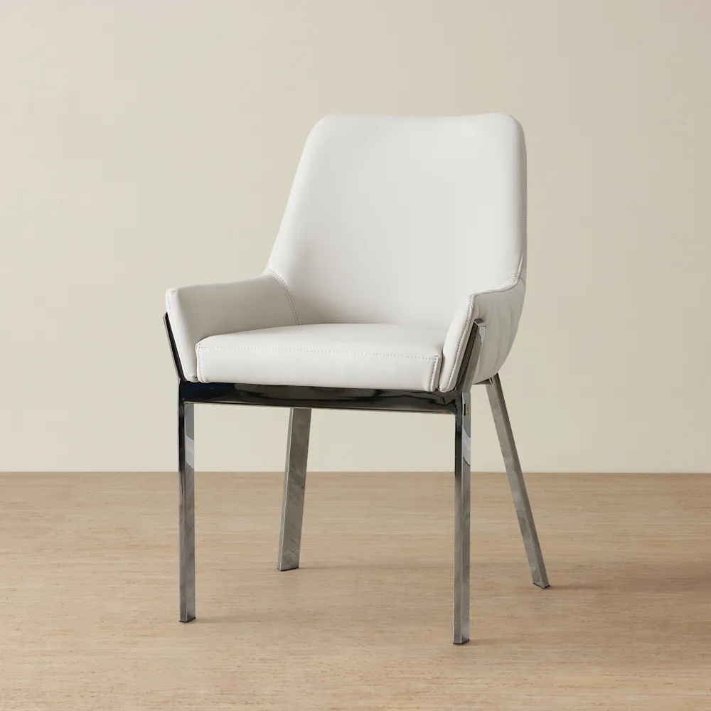 The Seat's carbon black colours create a sophisticated and inviting atmosphere. Complementing the luxe hues of the seat, the stylish steel frame of the Arya chair is finished in a black nickel colour. This contrast between the dark-coloured seat and the lustrous frame adds depth and character to the overall design. Pair the Arya with one of our majestic dining tables for a truly stunning combination.