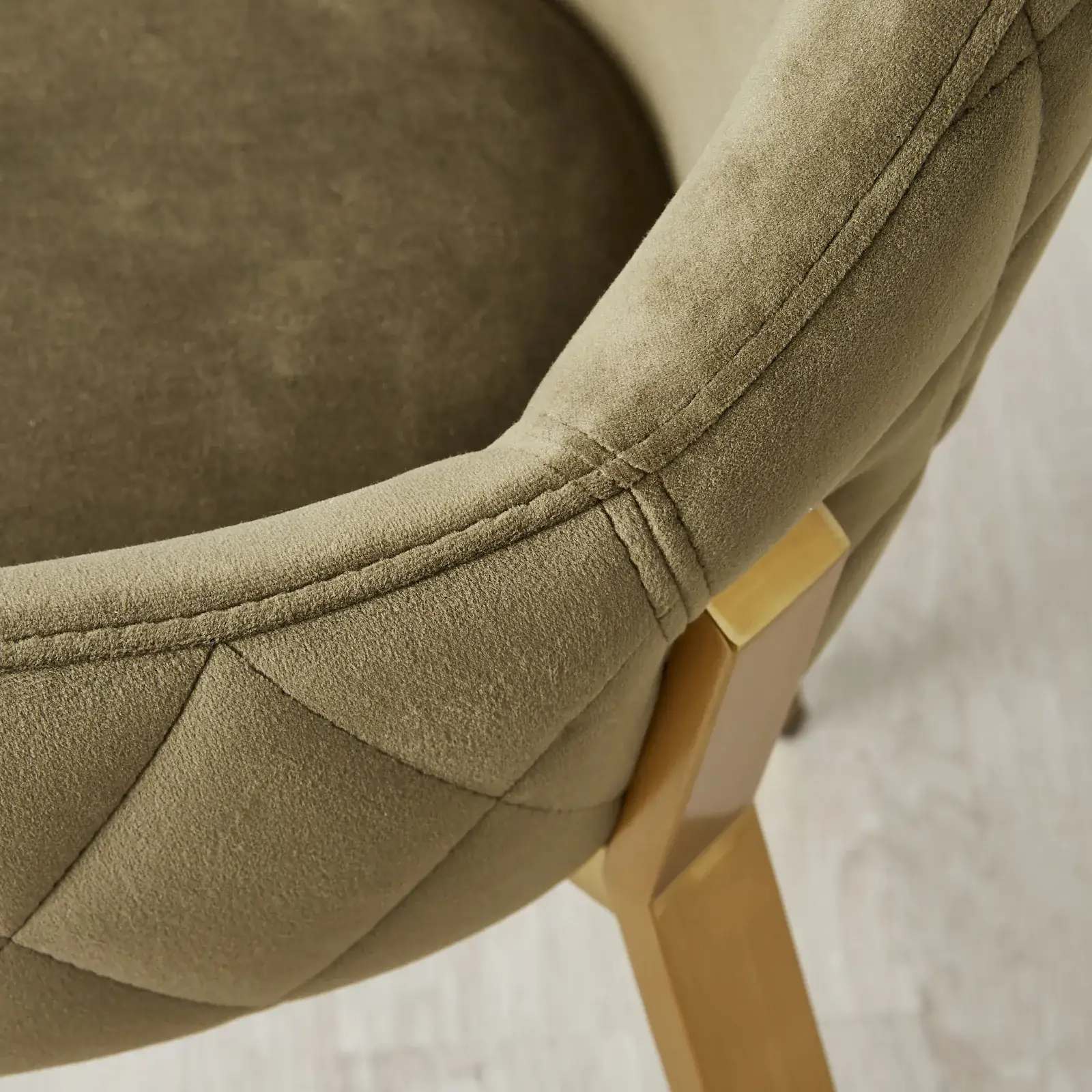 The luxurious velvet, in its rich olive green hue, adds an inviting warmth to your space while serving as an eye-catching focal point. Complementing the lush seat is a stylish steel frame, finished in lustrous gold. This striking contrast between the warm velvet seat and the golden frame infuses depth and character into the overall design, turning the Arya Counter Stool into an unforgettable piece of furniture.