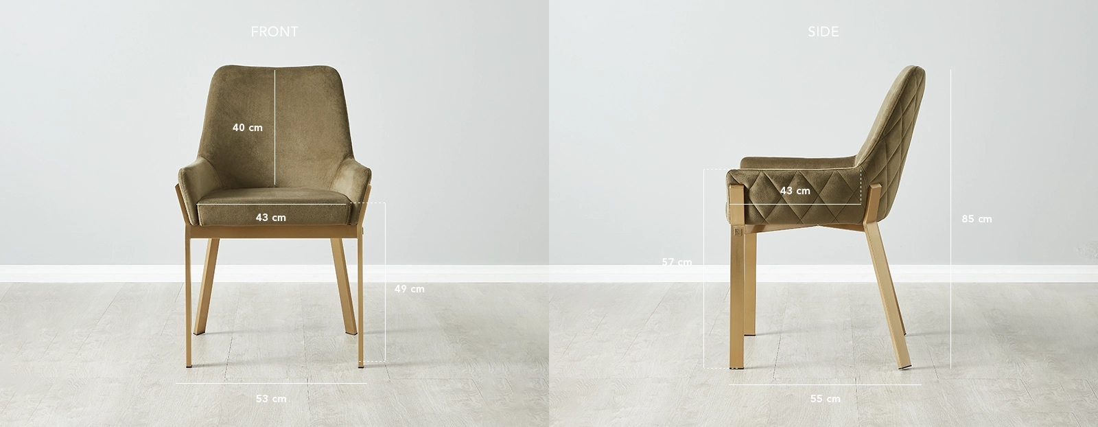 Its comfortable seat is meticulously upholstered in high-quality Velvet Fabric, showcasing its soft texture and adding a touch of opulence. The Sophisticated Olive Green colour of the seat creates a captivating and inviting atmosphere. Complementing its rich hues is its stylish frame, finished in Brushed Golden colours, providing depth and character to the overall design. Pair the Arya with one of our majestic dining tables for a truly stunning combination.