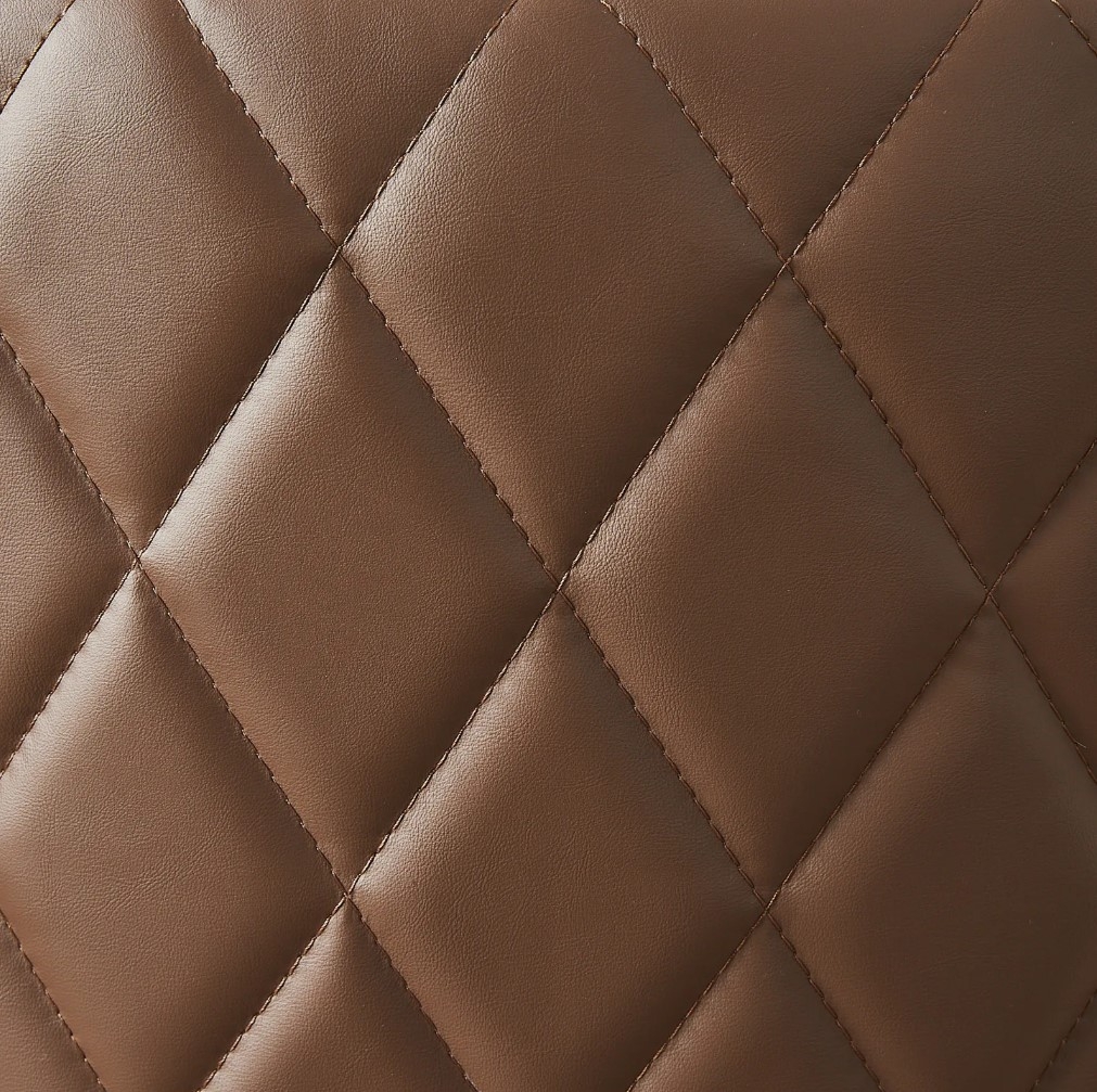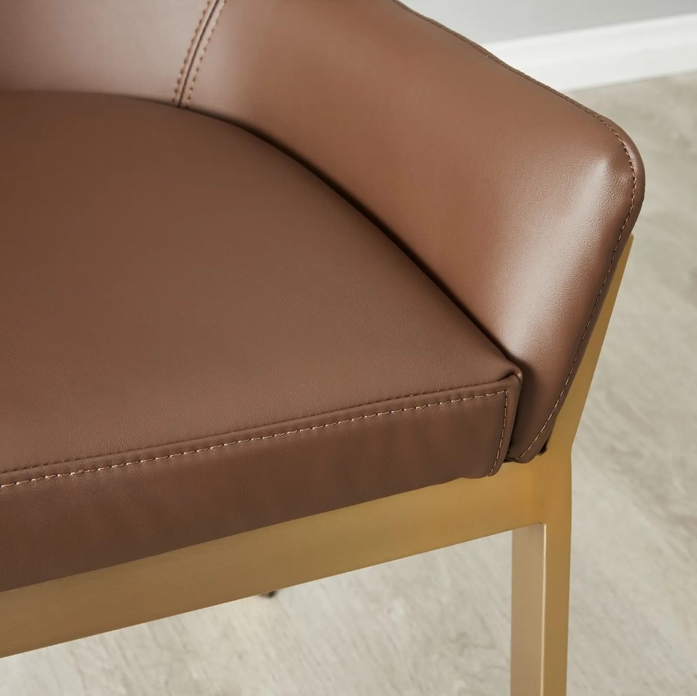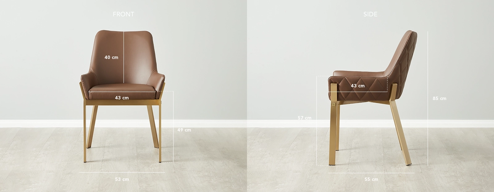 Its comfortable seat is meticulously upholstered in high-quality vegan leather, showcasing its lustrous texture and adding a touch of opulence. The warm Tuscan brown colour of the seat creates a cozy and inviting atmosphere. Complementing its rich hues is its stylish frame, finished in brushed golden colours, providing depth and character to the overall design. Pair the Arya with one of our majestic dining tables for a truly stunning combination.