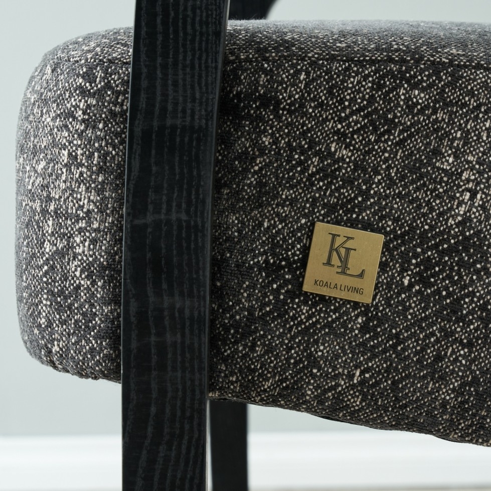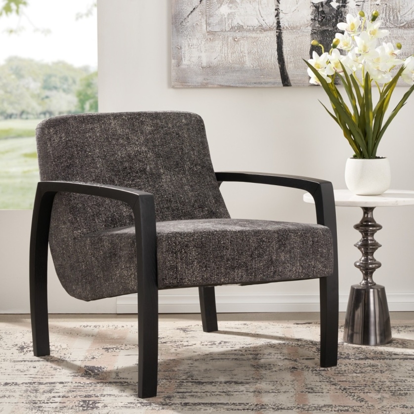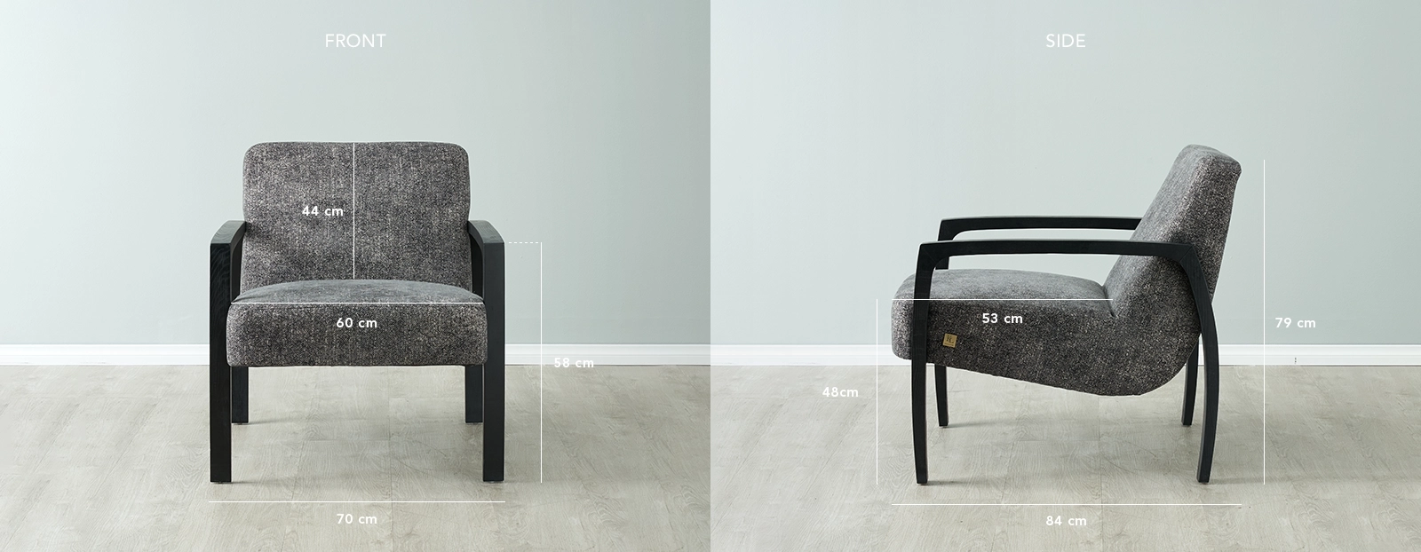 Astrid Armchair melds comfort and design with its large, cushioned seat draped in Distressed Grey Fabric.