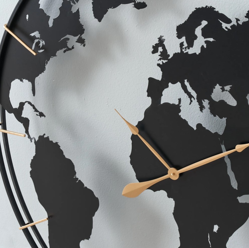 The clock's hands, adorned with intricate golden details, gracefully traverse this miniature globe, while the hours are subtly demarcated by elegant golden sections. This majestic timepiece doesn't merely tell time—it narrates stories of places near and far, right from your wall.