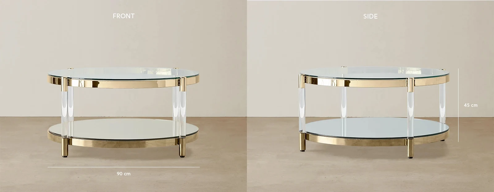 The Auryn Coffee Table combines glass, stainless steel, and acrylic for a sleek, modern design. Its clear glass tabletop is perfect for displaying keepsakes, while the mirrored lower section adds a unique touch.