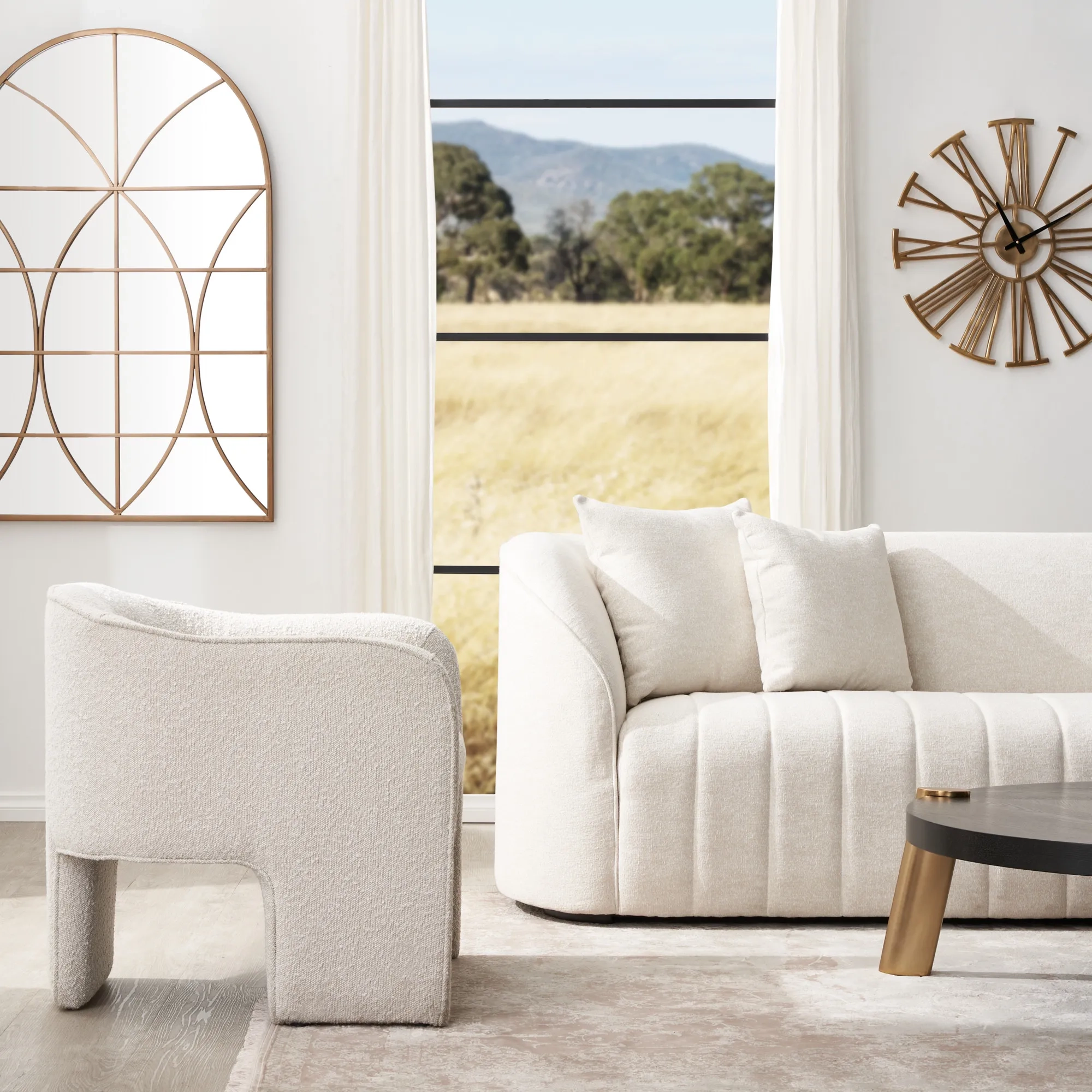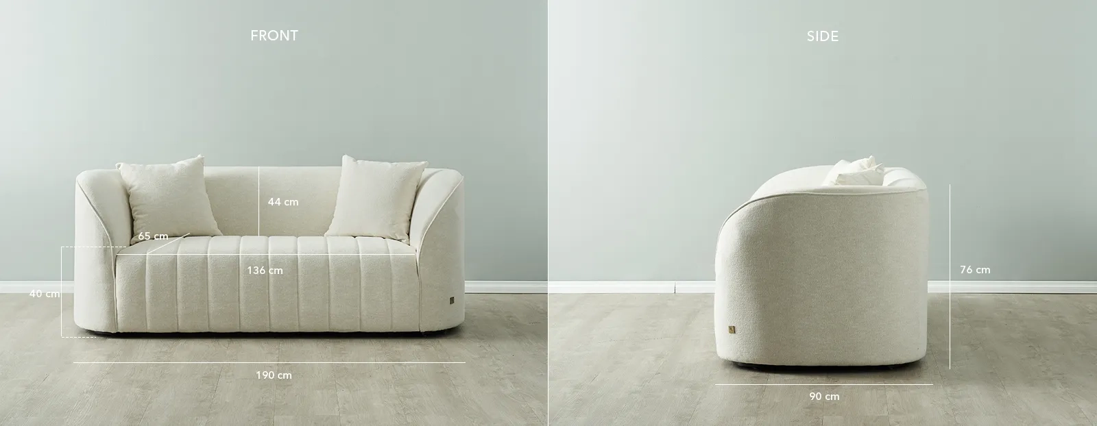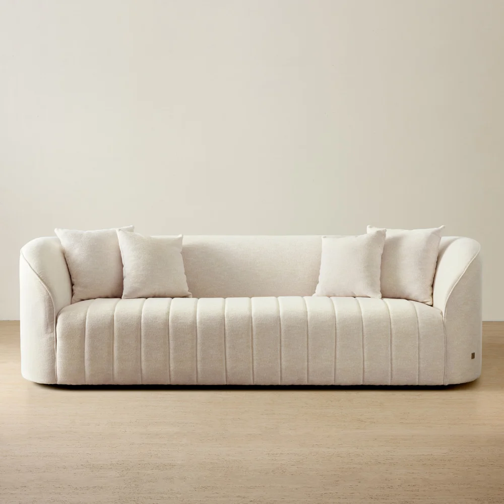 Feel embraced by its inward-curving shell-like frame, while plush cushions lined with dense foam offer extra comfort for all.