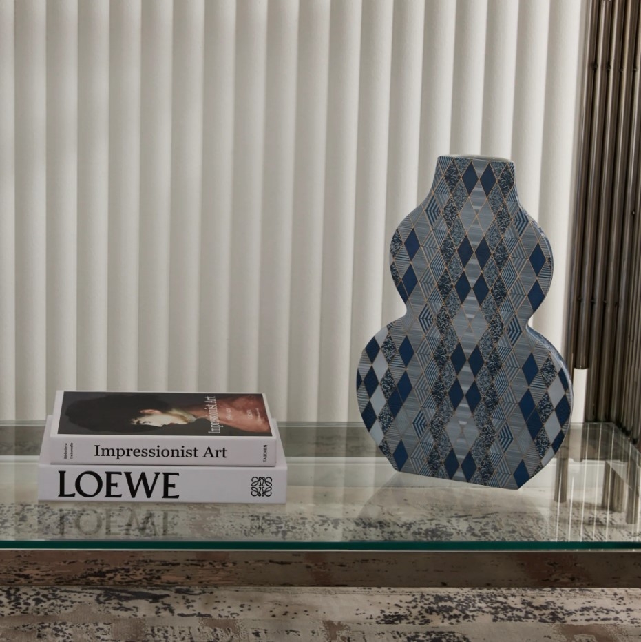 This aspect of the design pays homage to traditional aesthetics, bringing a sense of history and sophistication to your space. In contrast, the other halved portion of the Azure Vase presents a starkly different, yet harmonious, visual experience. Here, the same beautiful colors are reimagined in a modern geometric pattern.