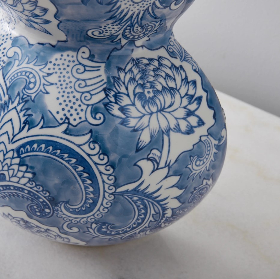 Enhance your home with a unique blend of classic elegance and contemporary flair using the Azure Halved Vase, a piece that beautifully marries the whimsical with the modern. This exceptional vase showcases a striking duality in design, offering a captivating visual narrative that's both artistic and functional. One side of the vase boasts classic curves and a delicate floral-inspired motif, reminiscent of timeless china patterns.