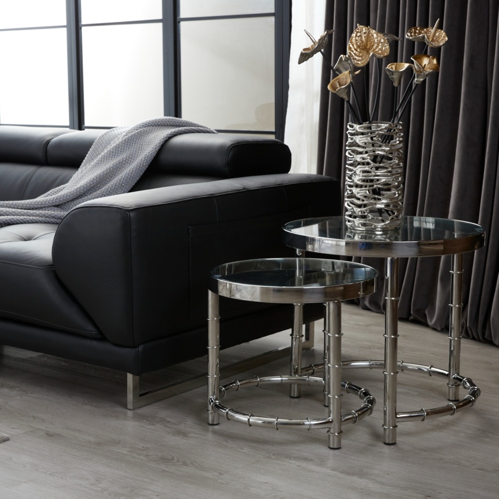 Each table possesses' a beautiful glass circular table top with enough space for your essentials or even modern decorations. The Balmoral Round Nested Side Tables frame features a stylish contemporary design, made with masterfully crafted stainless steel accented with silver rings. The silver rings decorated on the frame echo the look of bamboo culms, which adds another layer of beauty to the piece. The Balmoral is best paired with one of our majestic sofas and perhaps a vase of flowers.