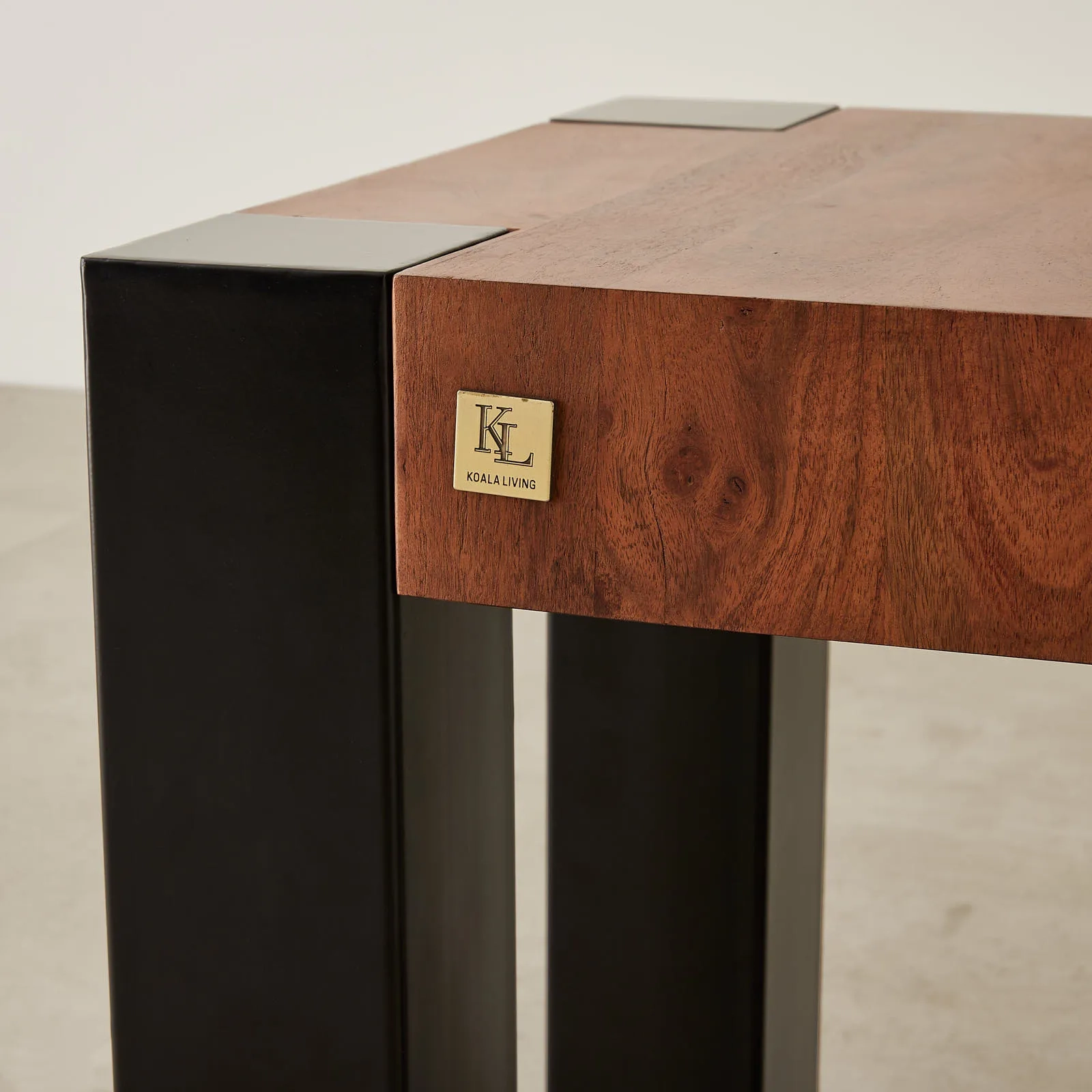The Benedict Medium Brown Wooden Side Table features a design that seamlessly marries rustic charm with industrial flair. The tabletop's medium brown hue adds a touch of earthiness, while the matte black metal legs provide a stark, modern contrast, grounding the piece with a contemporary edge. This side table boasts a form that is both robust and stylish.