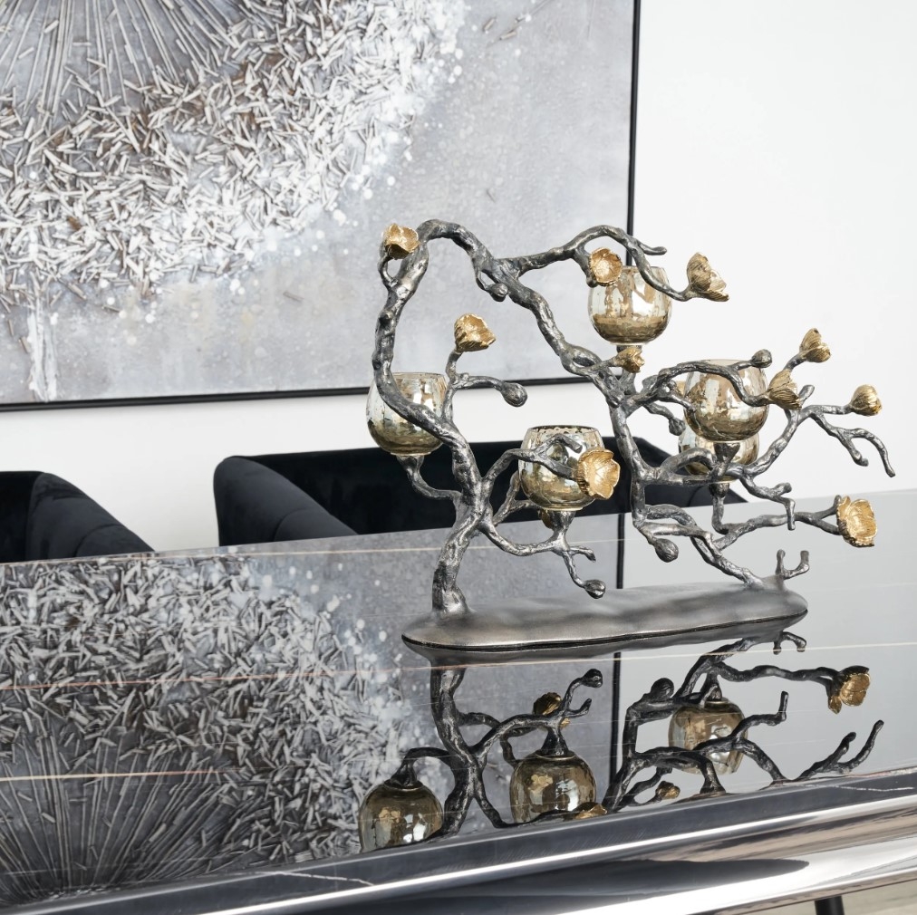The centerpiece of this candle holder lies in its branches, masterfully crafted to strike a balance between lifelike and abstract. Adorning these branches are delicate golden petals that unfurl like nature's artistry in motion. These petals are more than just embellishments; they are emblematic of luxury and splendor, casting a golden glow that dances with the candlelight.
