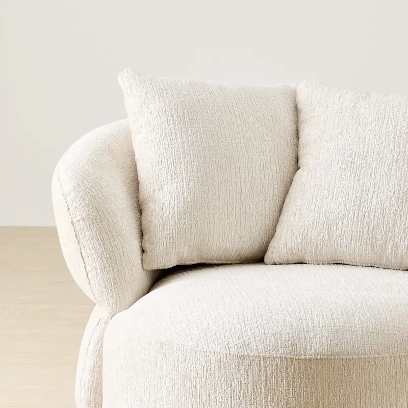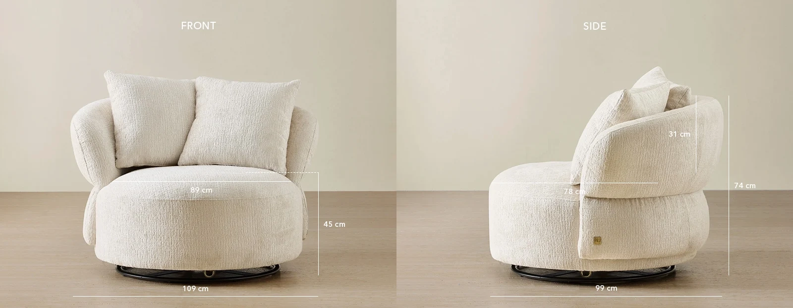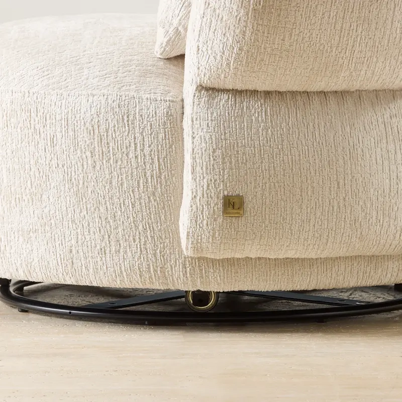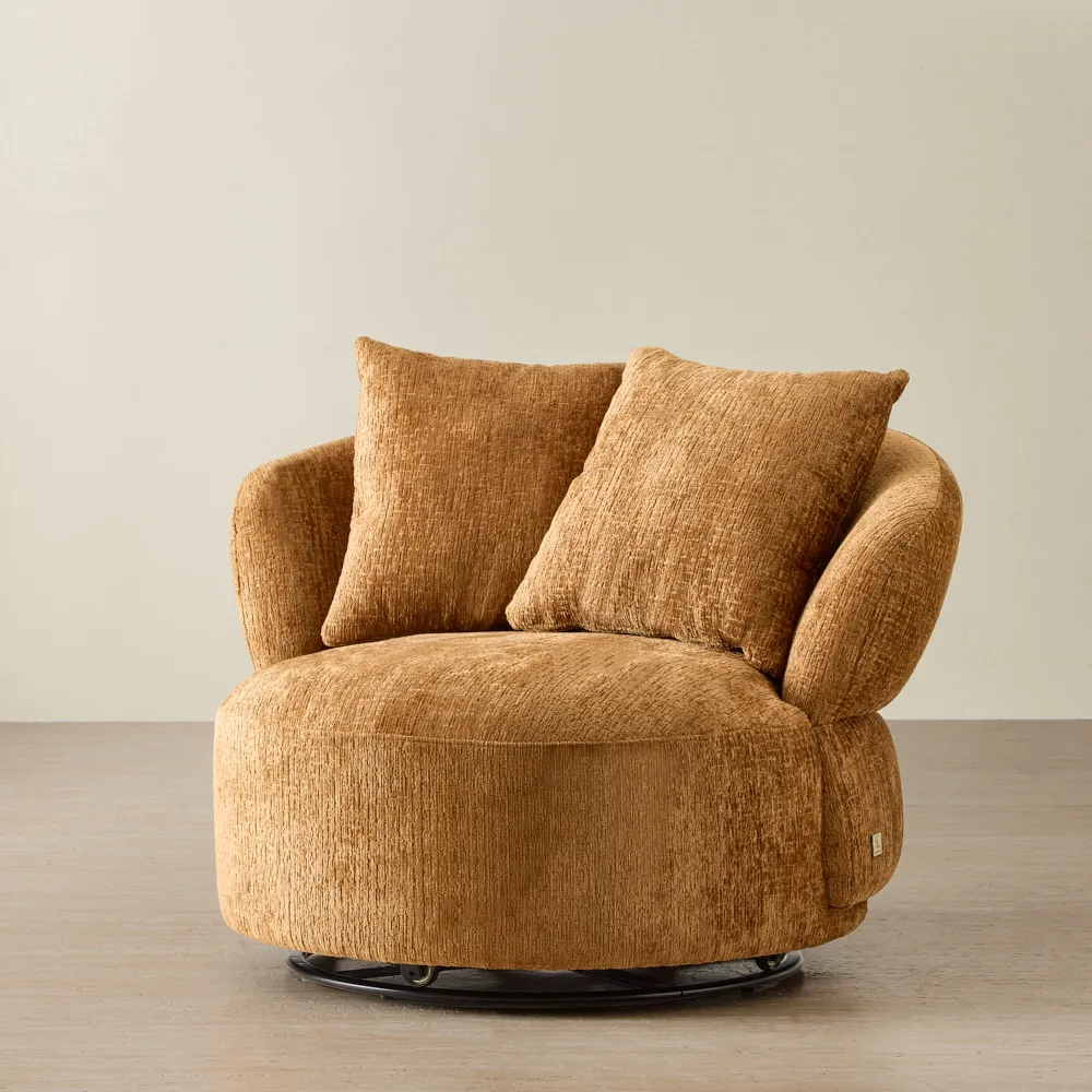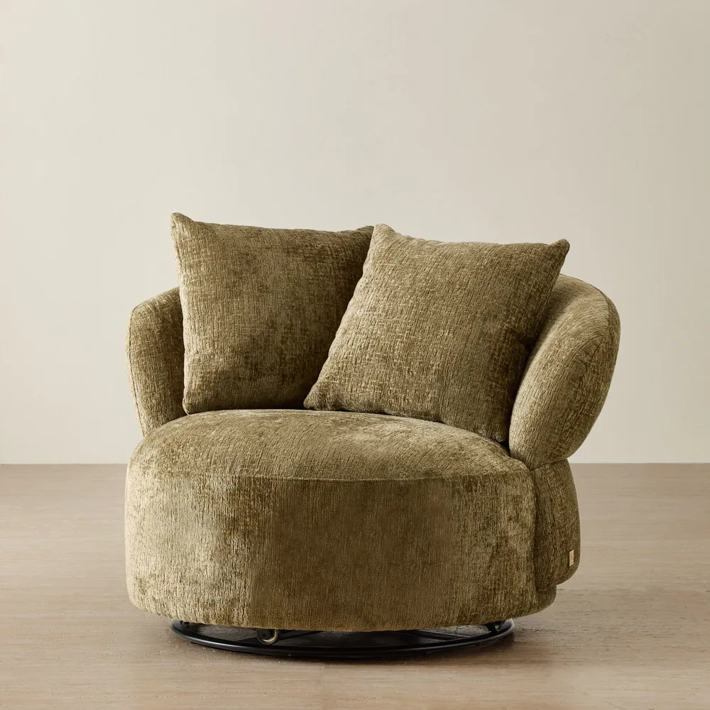 Designed with a generous circular form, this chair offers an enveloping seat supported by plush cushions that encourage long, relaxed sits. A smooth swivel base underneath brings subtle movement, pairing comfort with functional versatility.