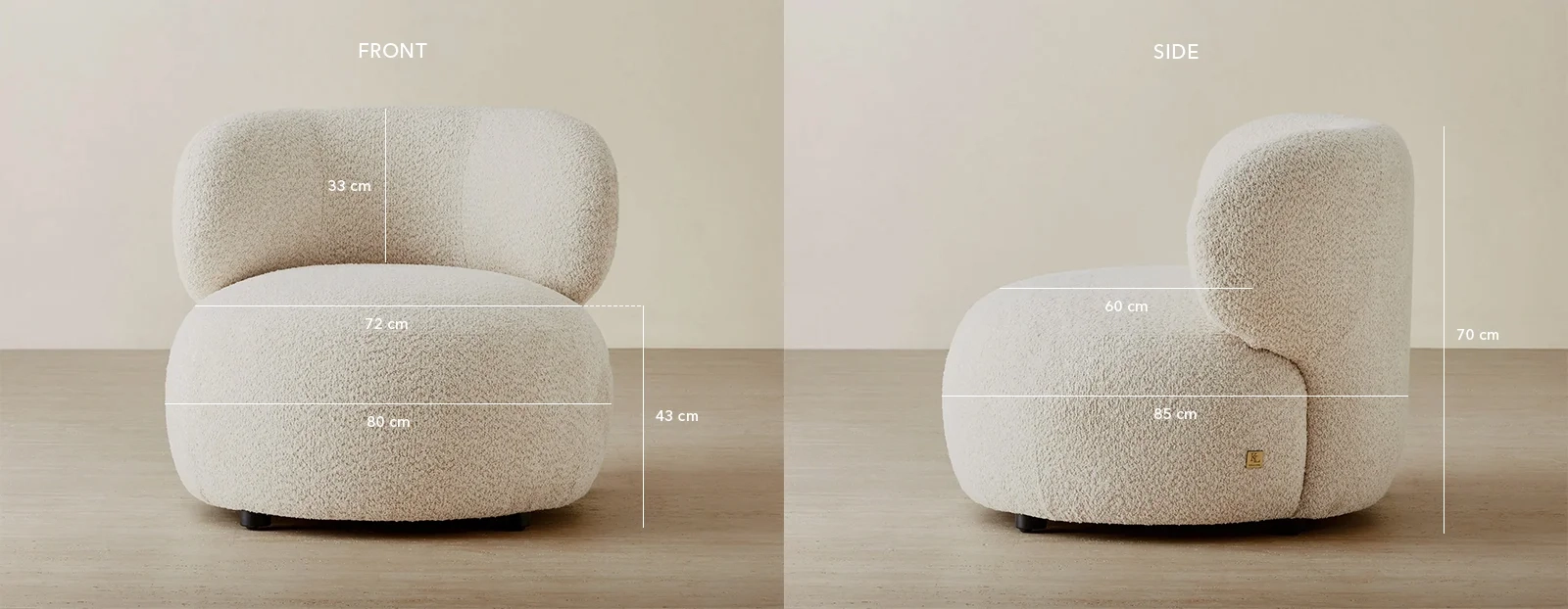 Grounded by a simple base, it blends form and function with quiet confidence. The generous seat and gently rounded backrest offer a grounded, cocoon-like experience, ideal for slow moments and quiet pauses.