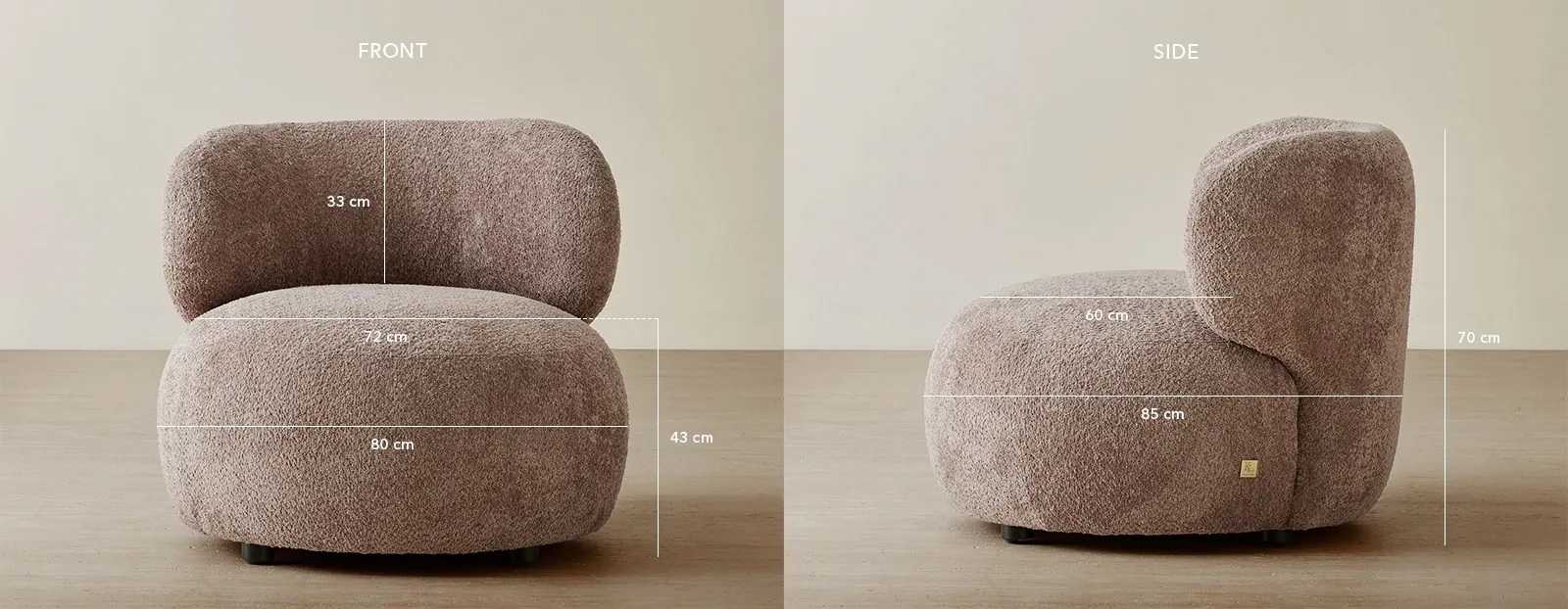 Grounded by a simple base, it blends form and function with quiet confidence. The generous seat and gently rounded backrest offer a grounded, cocoon-like experience, ideal for slow moments and quiet pauses.