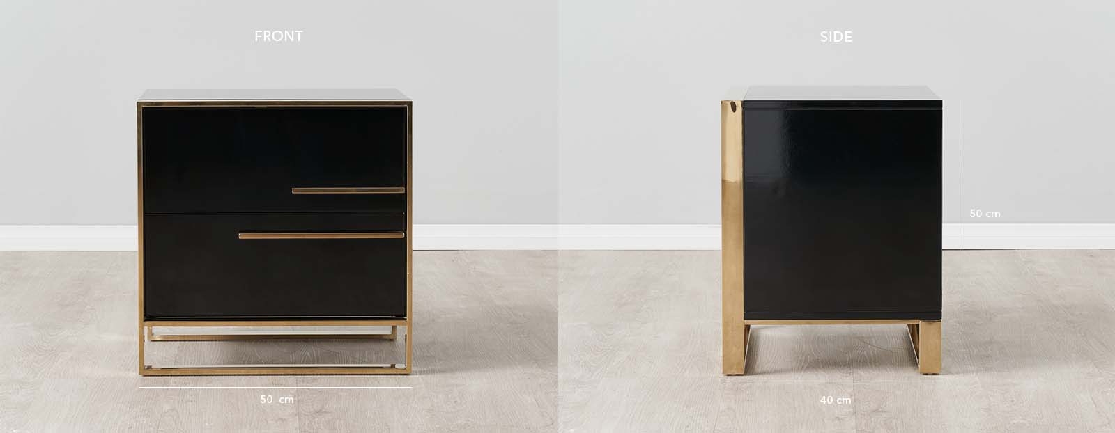 Open up the drawers to reveal masterfully crafted storage spaces, thoughtfully designed to meet your curating needs. With the right amount of space, the drawers provide ample room to keep your essentials organized and easily accessible. With its minimalist design, luxe black finish, and accents of gold, the Broden Bedside Table effortlessly adds a luxurious touch to any bedroom. It becomes a focal point that exudes modern elegance, enhancing the ambiance of your sleeping sanctuary.