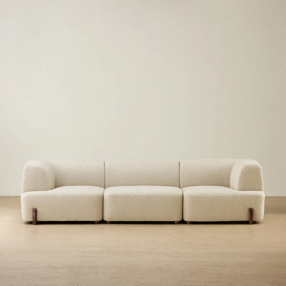 Deep, expansive cushions invite the body to settle in, shaping a lounging experience that feels both relaxed and snug. Supported by discreet minimalist feet that keep the design light and modern. This configuration seats three comfortably.