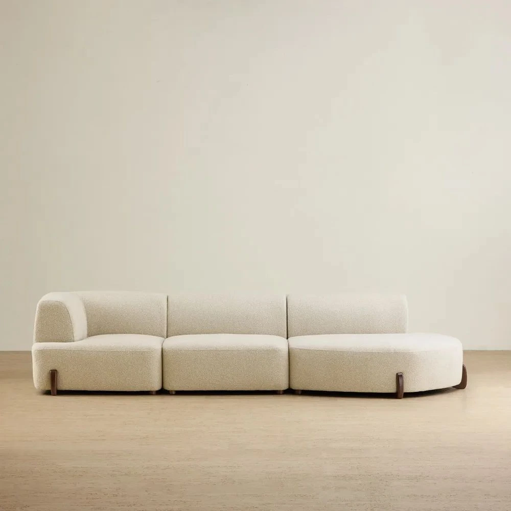 Deep, expansive cushions invite the body to settle in. The right-side chaise extends the piece for full-stretch comfort, supported by discreet minimalist feet that keep the design light and modern. This configuration seats three comfortably.
