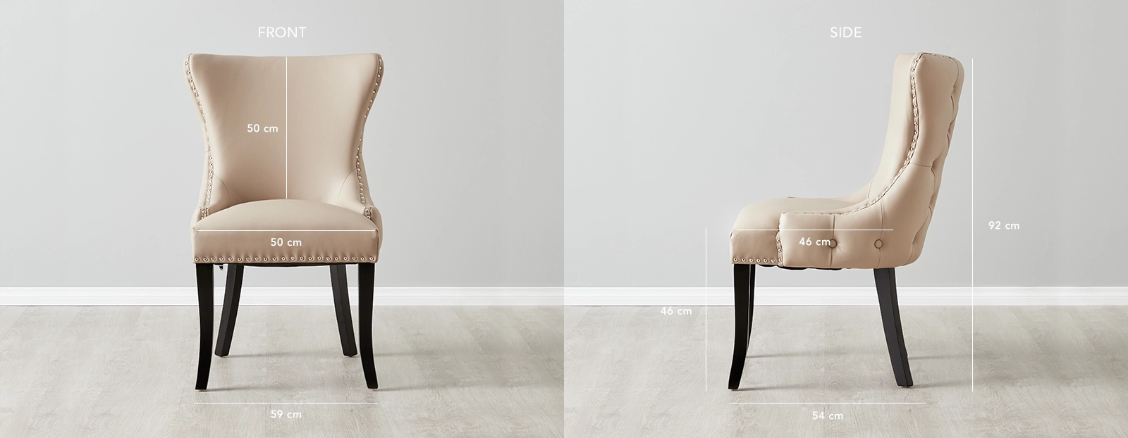 Drawing inspiration from classical aesthetics, the Camille chair boasts a backrest adorned with button tufting. This intricate detailing not only adds sophistication to the design but also creates a plush and inviting look. Accentuating the luxurious aesthetic of the Camille Dining Chair are rows of silver studs that line the chair's outline. These shimmering studs serve as elegant embellishments, enhancing the overall visual appeal. Pair an ensemble of Camille Dining Chairs with one of our majestic Dining Tables.