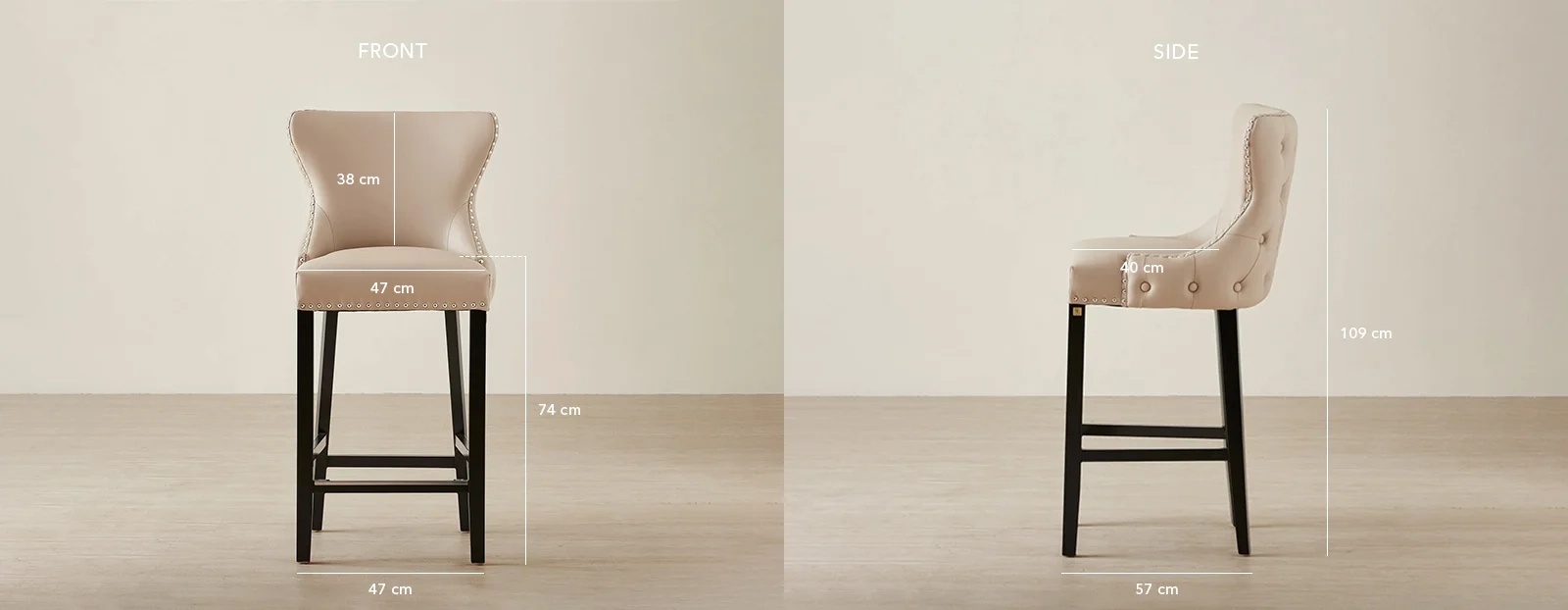 Turn your home bar into a haven of sophistication with the Camille III Bar Stool. Its Beige Vegan Leather seat, accented with refined button studding and intricate tufting, enhances both comfort and visual appeal.