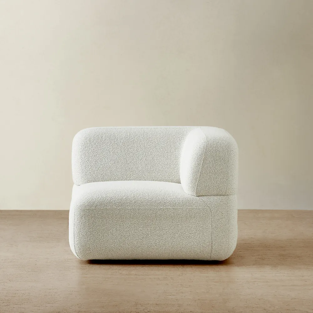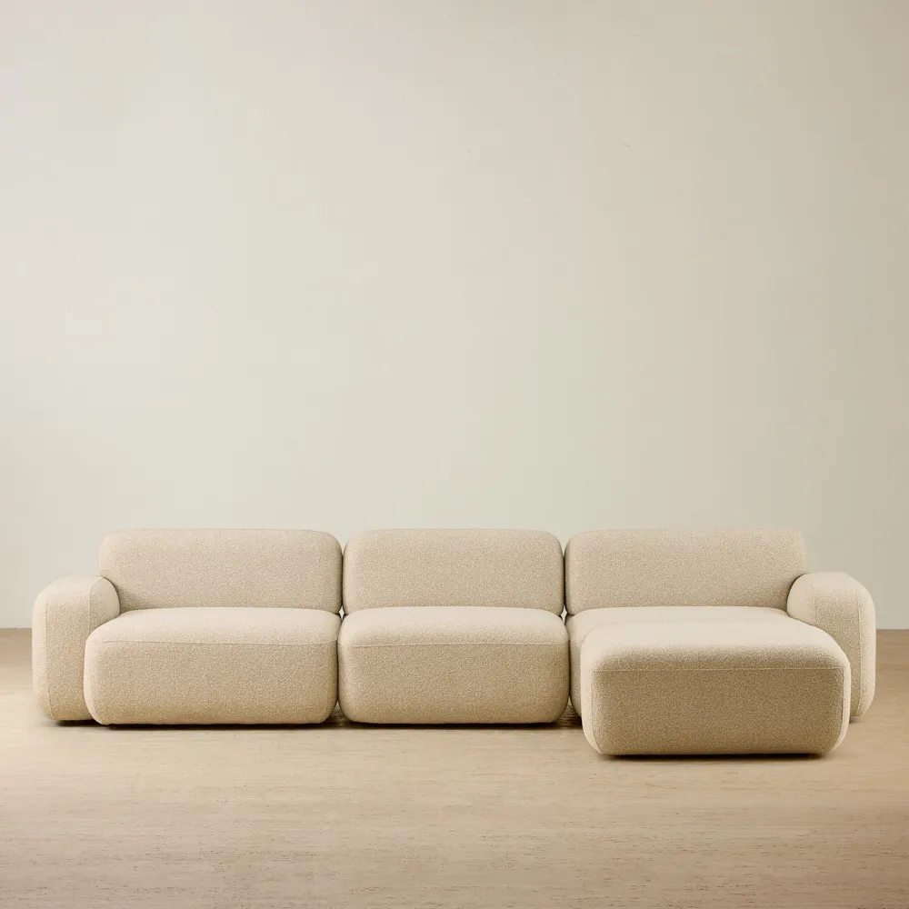 The Capri 4-Piece Sofa with Ottoman is wrapped in textured stone white fabric, offering a soft, tactile surface with modern sensibility. Its modular design, low-profile silhouette, and rounded edges lend a sculptural, relaxed presence to any living space.