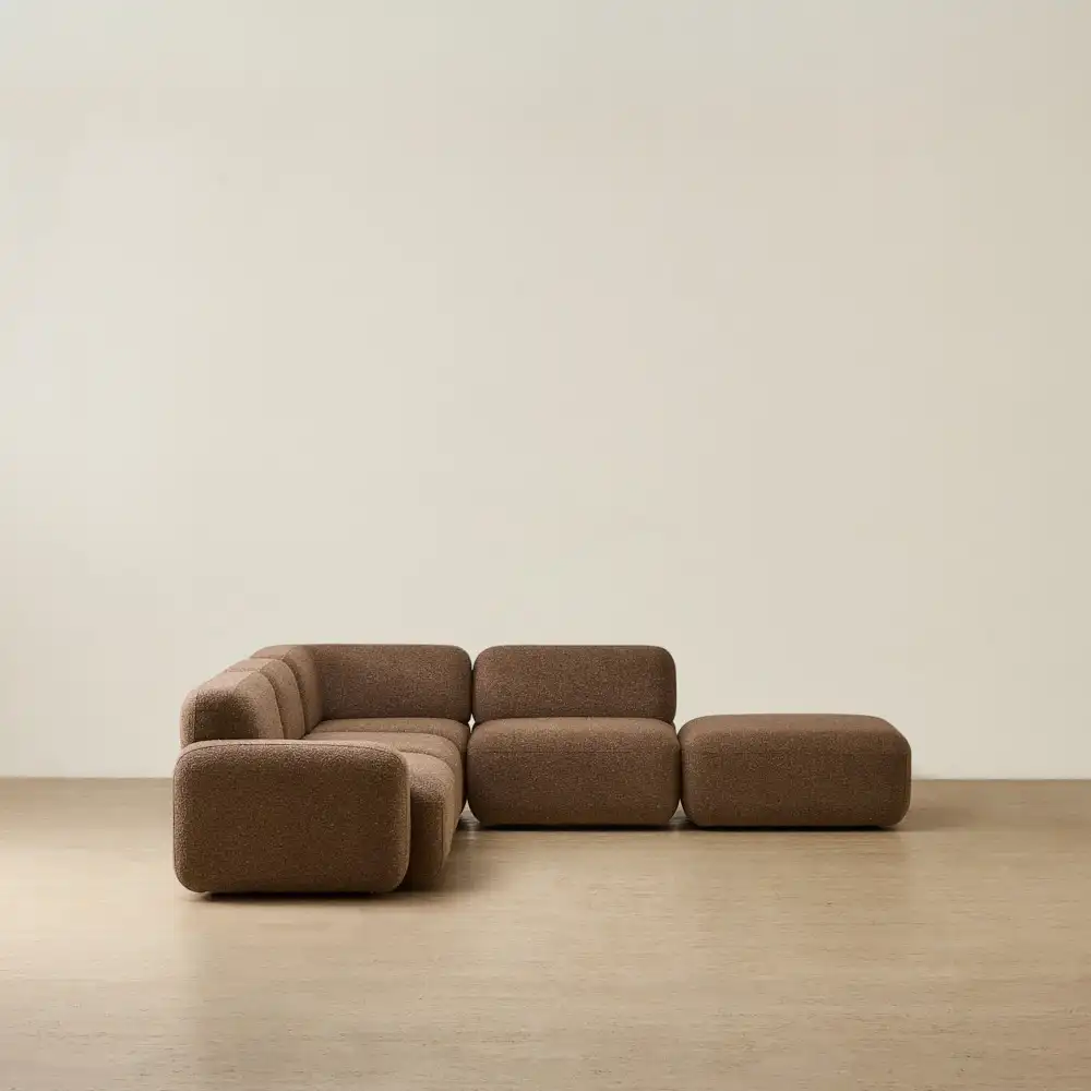 The Capri 5-Piece Sofa is wrapped in textured stone white fabric, offering a soft, tactile surface with a modern sensibility. Its modular design, low-profile silhouette, and rounded edges lend a sculptural, relaxed presence to any living space.