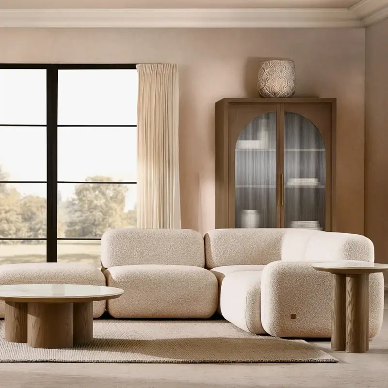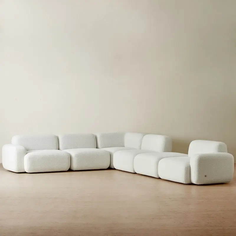 The stone white fabric enhances its minimalist appeal, offering a timeless backdrop for your living area. With a versatile modular design, it combines both style and comfort, adapting to your space with ease.