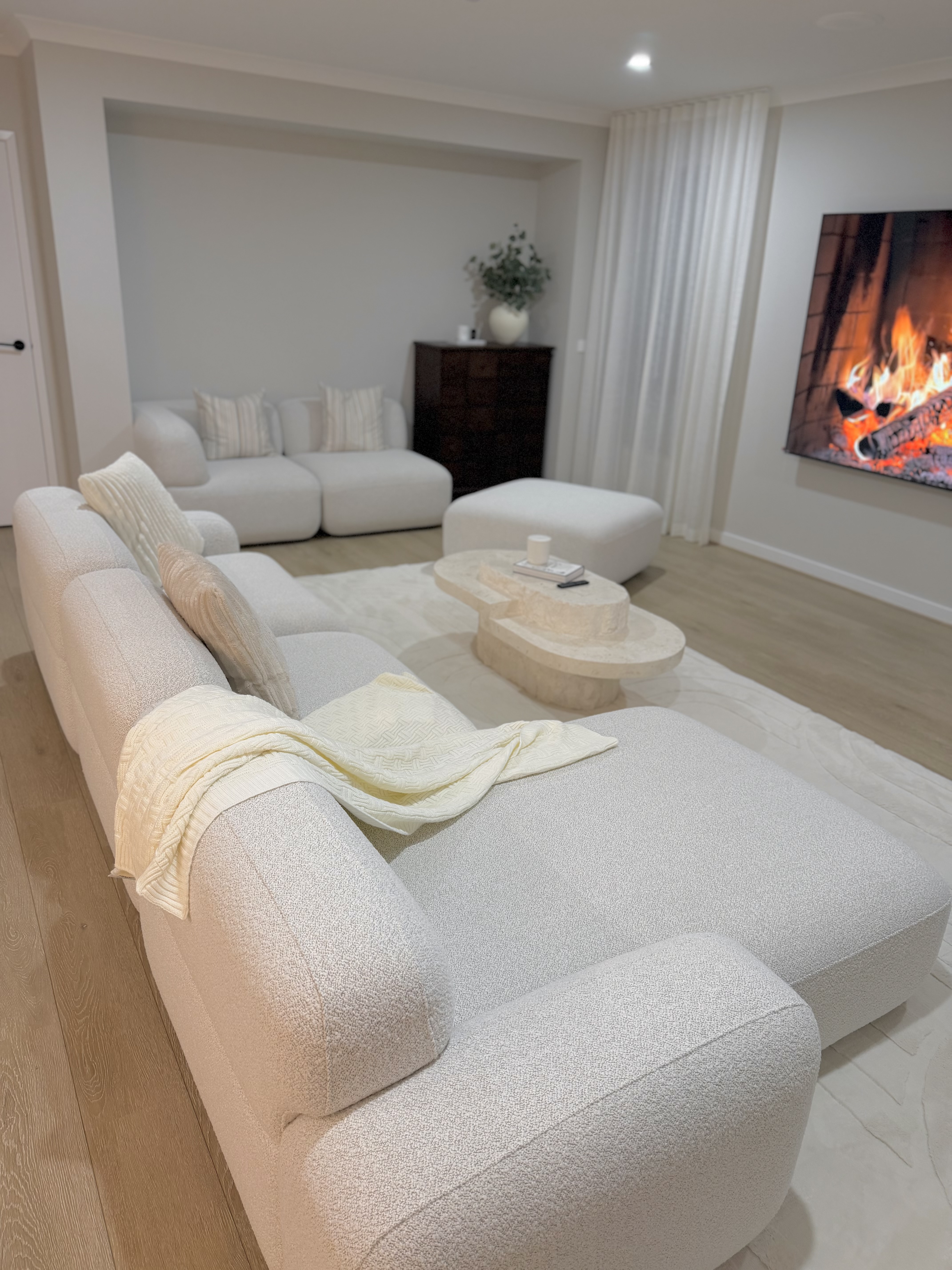 The Capri Sofa offers a soft, tactile surface with a modern feel upholstered in textured stone white fabric. Its low-profile form and rounded edges create a relaxed, sculptural presence.