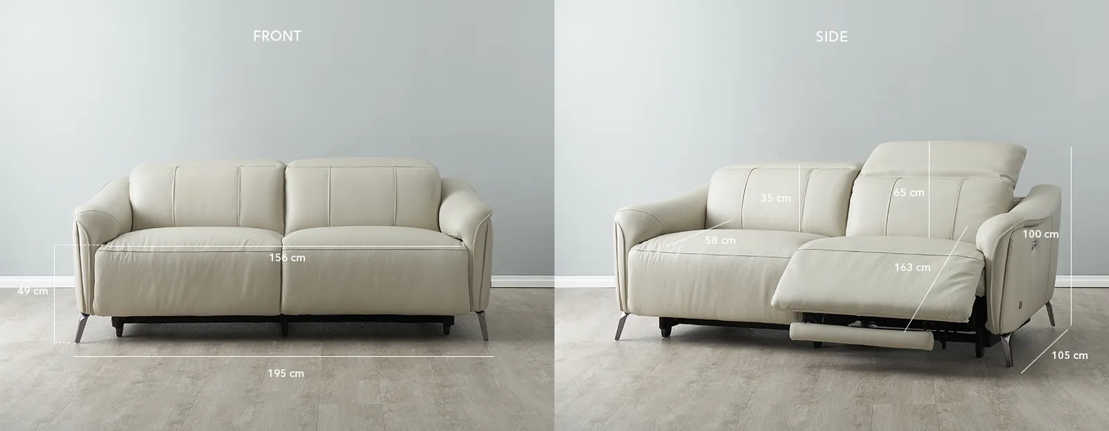 Rest easy with the modern luxury of the Carolina 2-Seater Electric Recliner. Its cream coloured leather upholstery adds a touch of distinction, while high-density foam ensures comfort for relaxation.