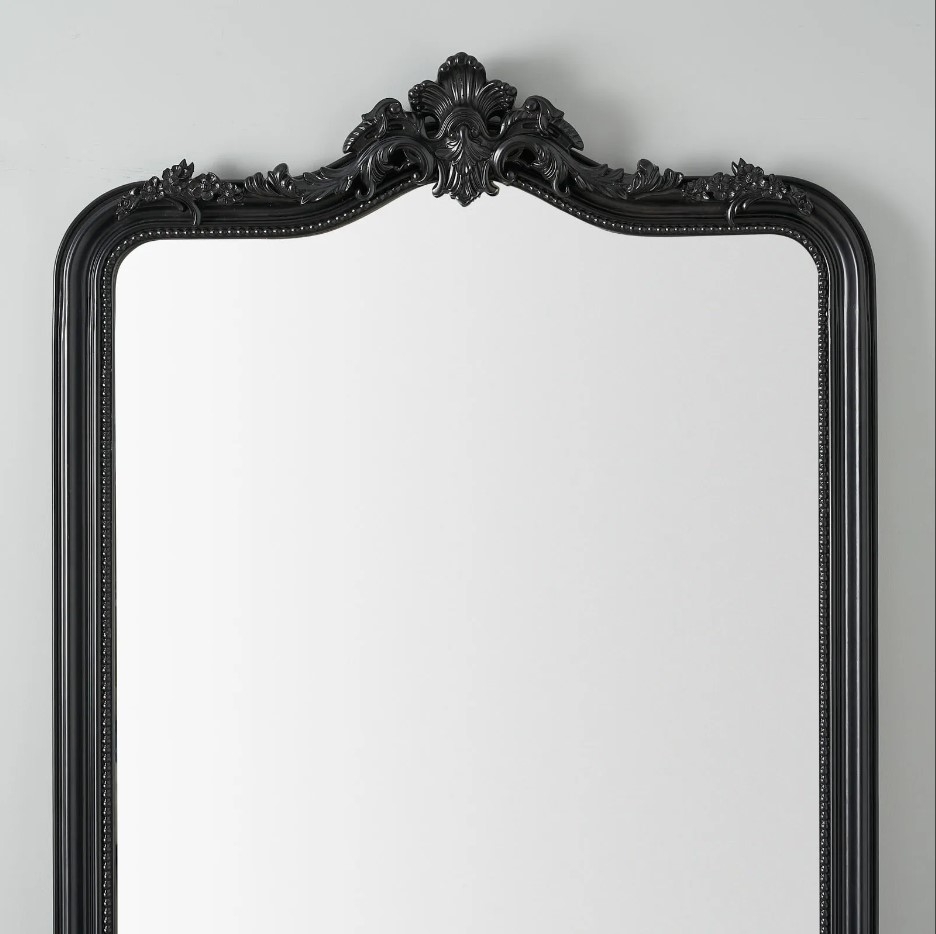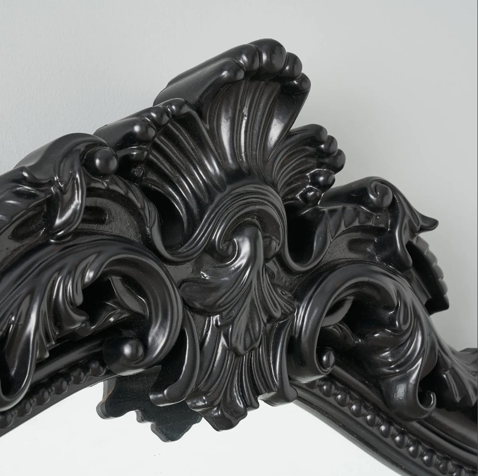 The Circe Black Wooden Mirror exudes a sense of grandeur and unparalleled beauty. The mirror's design harks back to the opulent styles of the past, featuring an ornate frame with intricate carvings and embellishments. The top of the mirror boasts a flamboyant crest, adding to its regal presence.