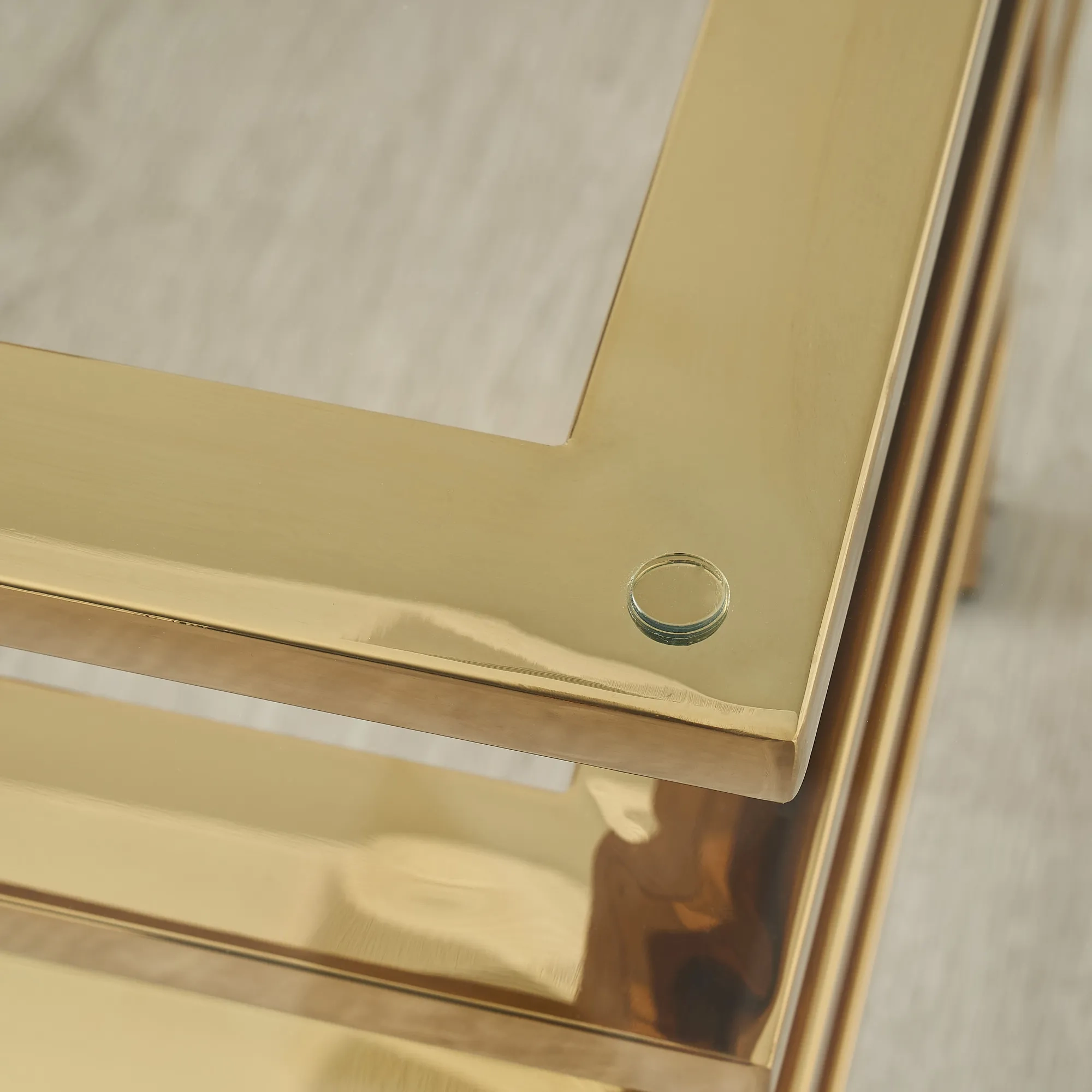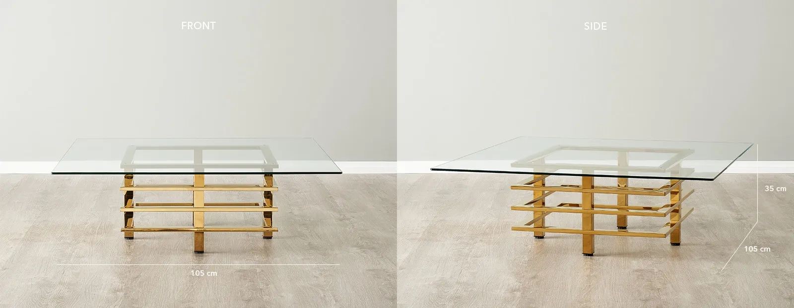 The Clarette Gold Coffee Table features a square glass tabletop that provides ample space for decor or daily use. The transparent glass enhances the living room's light, airy feel while blending effortlessly with various interior styles.