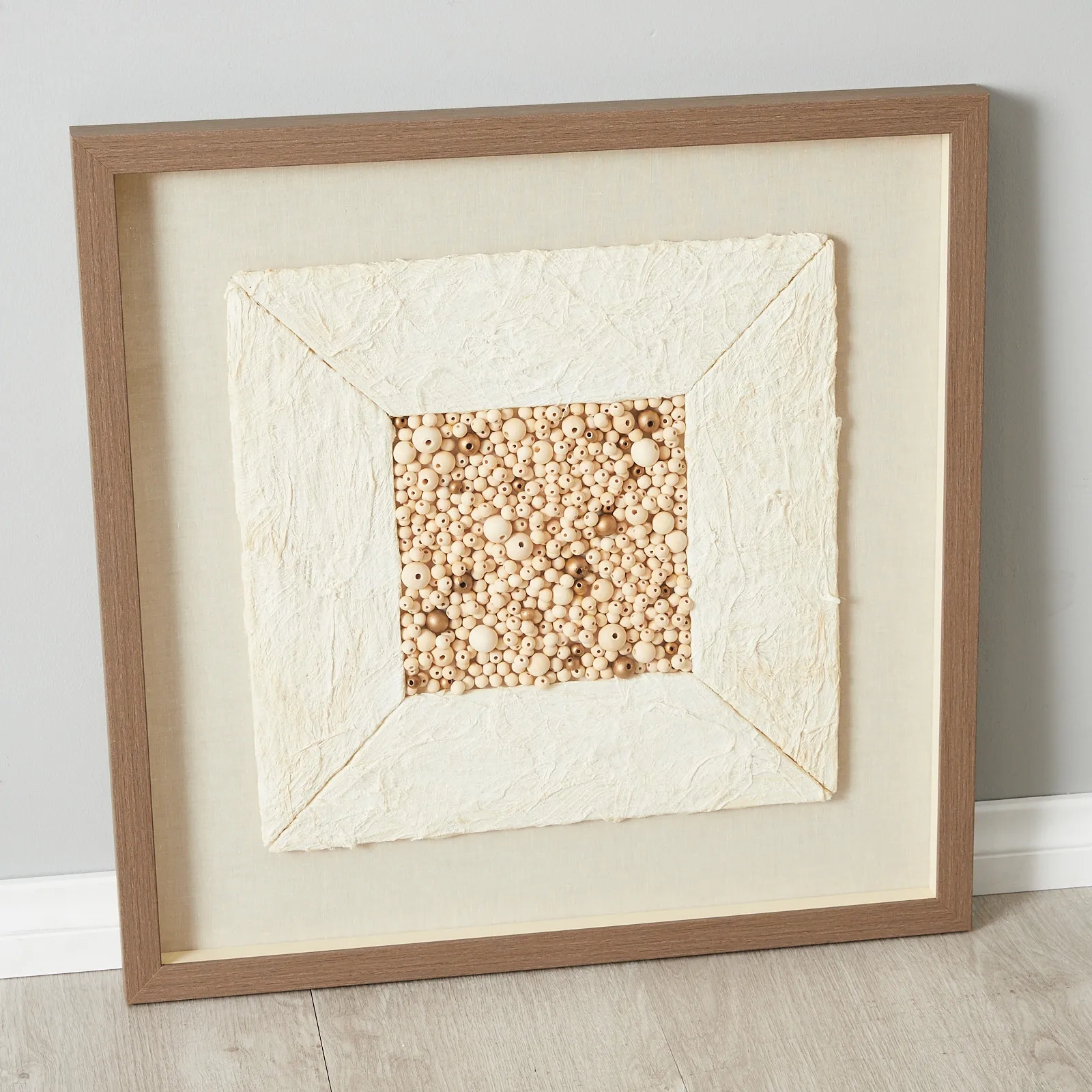 The Closure Paper Pulp Shadow Box with its light brown frame is a work of art that seamlessly marries creativity and elegance. At its heart lies an exquisite border composed of delicate paper pulps, expertly crafted to enclose a captivating array of beads in soft cream and beige hues.