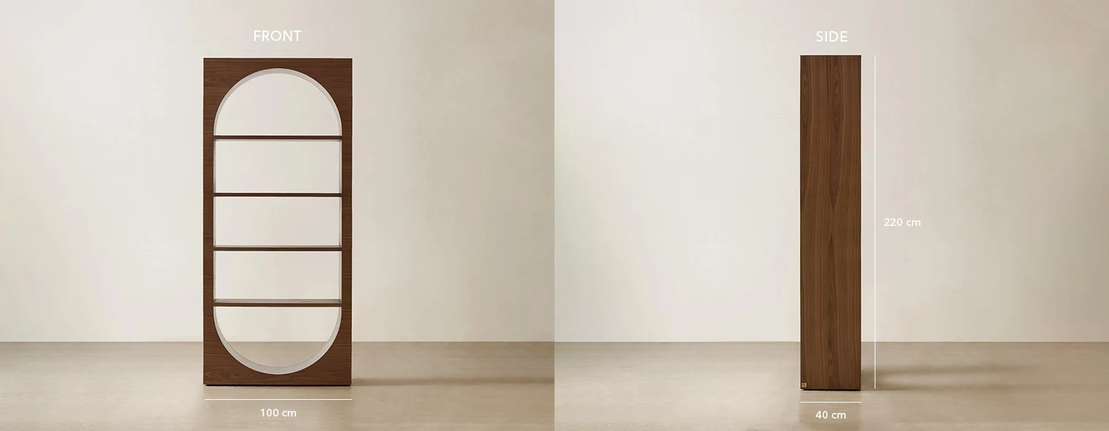The Costanza Bookshelf features an architectural silhouette defined by its oval cutout and clean vertical lines. Its shape brings a sculptural moment to the room while still feeling balanced and understated.