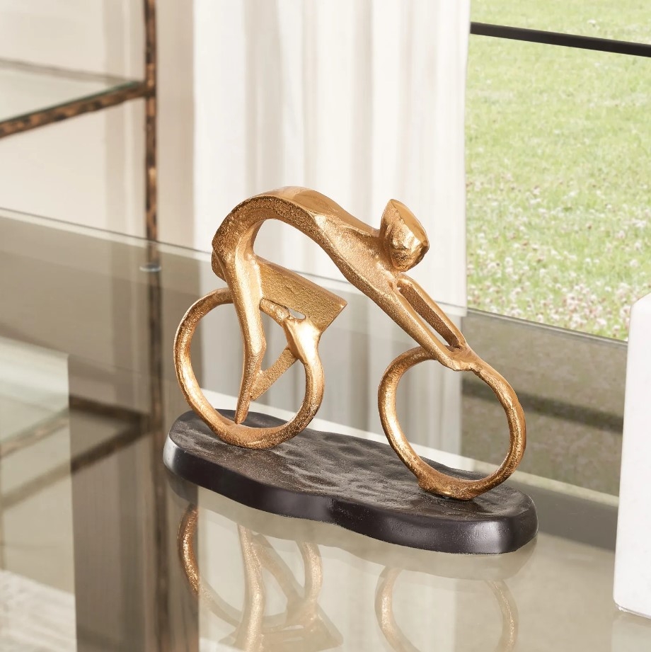 The choice of high-grade aluminum as the material lends the piece both a lightweight grace and a sturdy presence, while the golden hue that envelops the cyclist exudes luxury and radiance, making it a striking centerpiece.