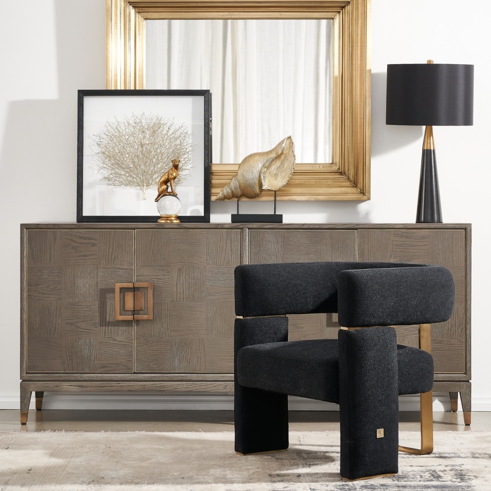 The Daniella features sophisticated black woven fabric upholstery complemented by a striking golden-coloured stainless steel frame, enhancing its luxurious lustre and elegance.